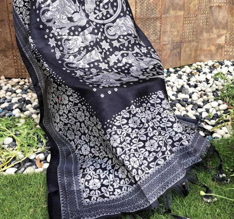 Elegant Madhubani Art On Ebony Black Dupatta