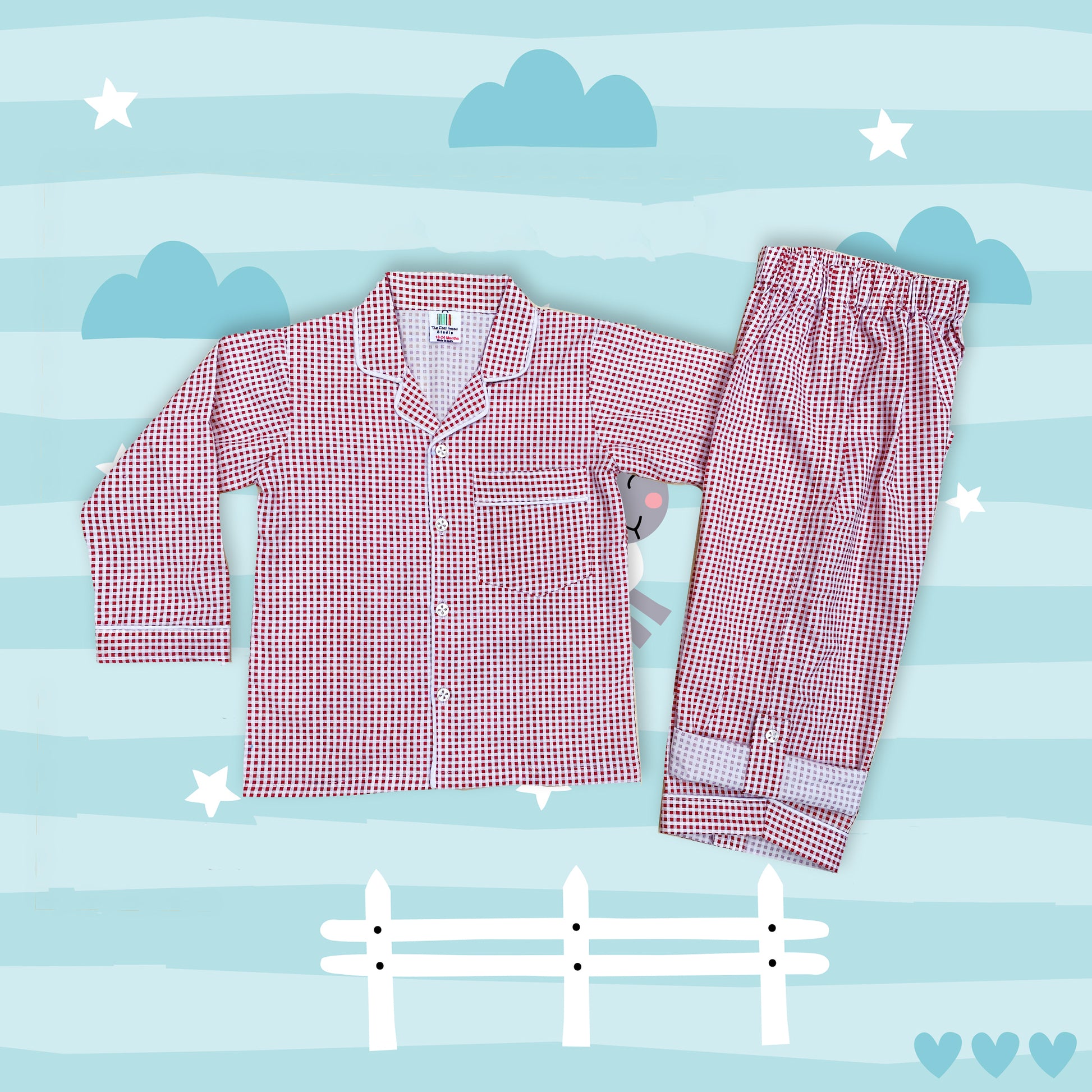 Evergreen Checkered print night suit on softest cotton fabric. It comes with a practical button roll up feature in all pajamas till the age of 5 which helps in effectively adjusting the length of the bottoms for a couple of years without worrying about them growing up too fast.
