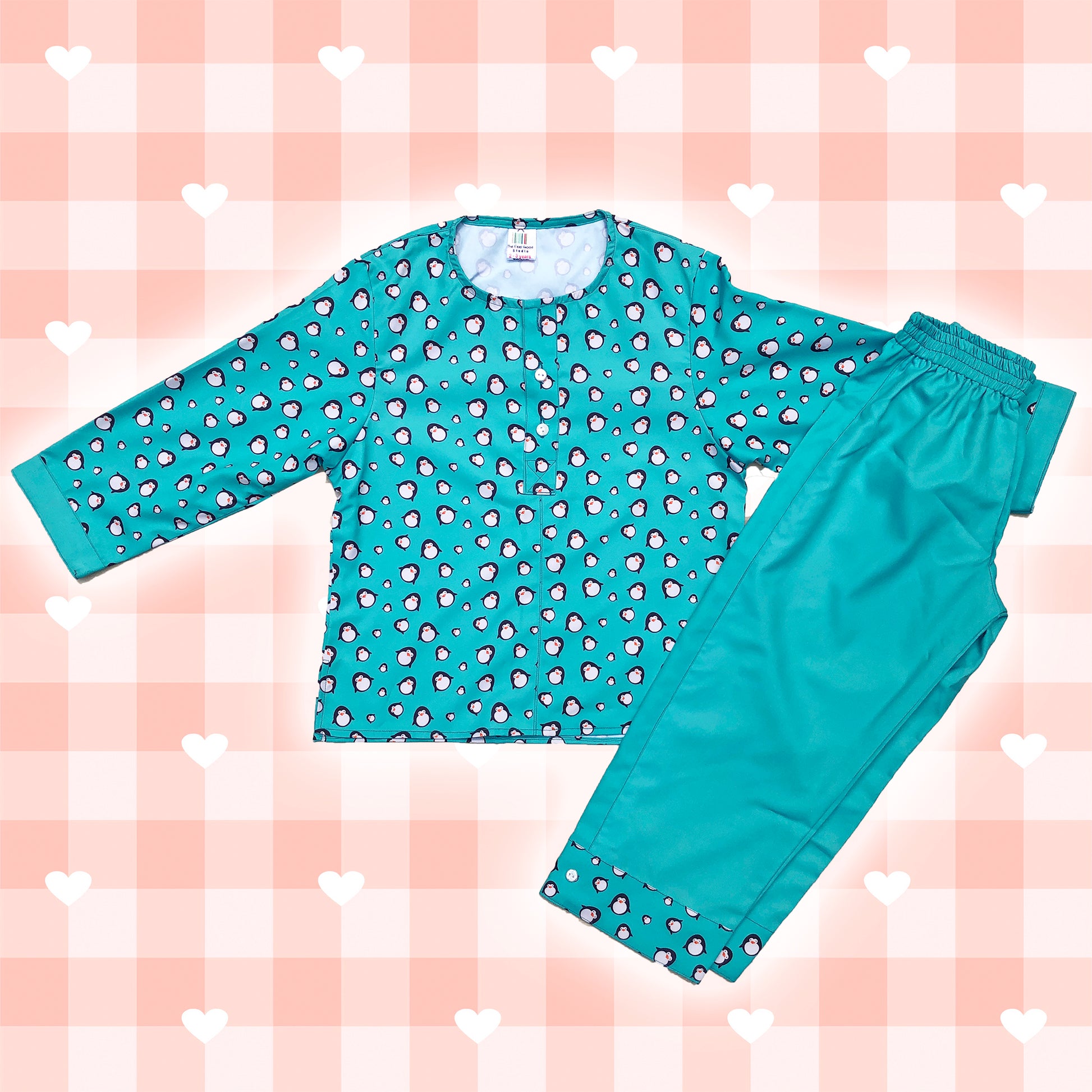 Baby penguin print night suit in soft and quick dry butter cotton (polycotton) fabric. It comes with a practical button roll up feature in all pajamas till the age of 5 years.