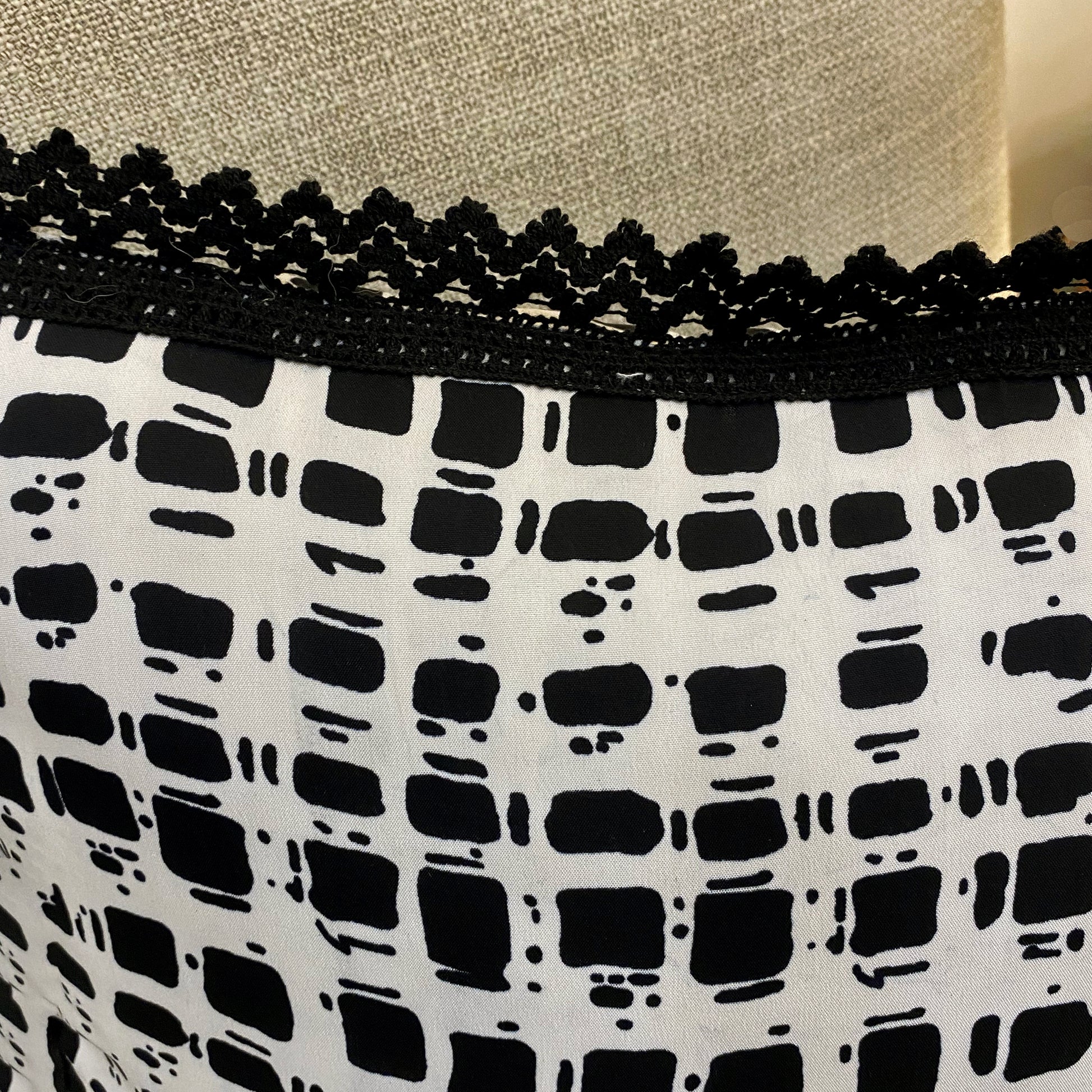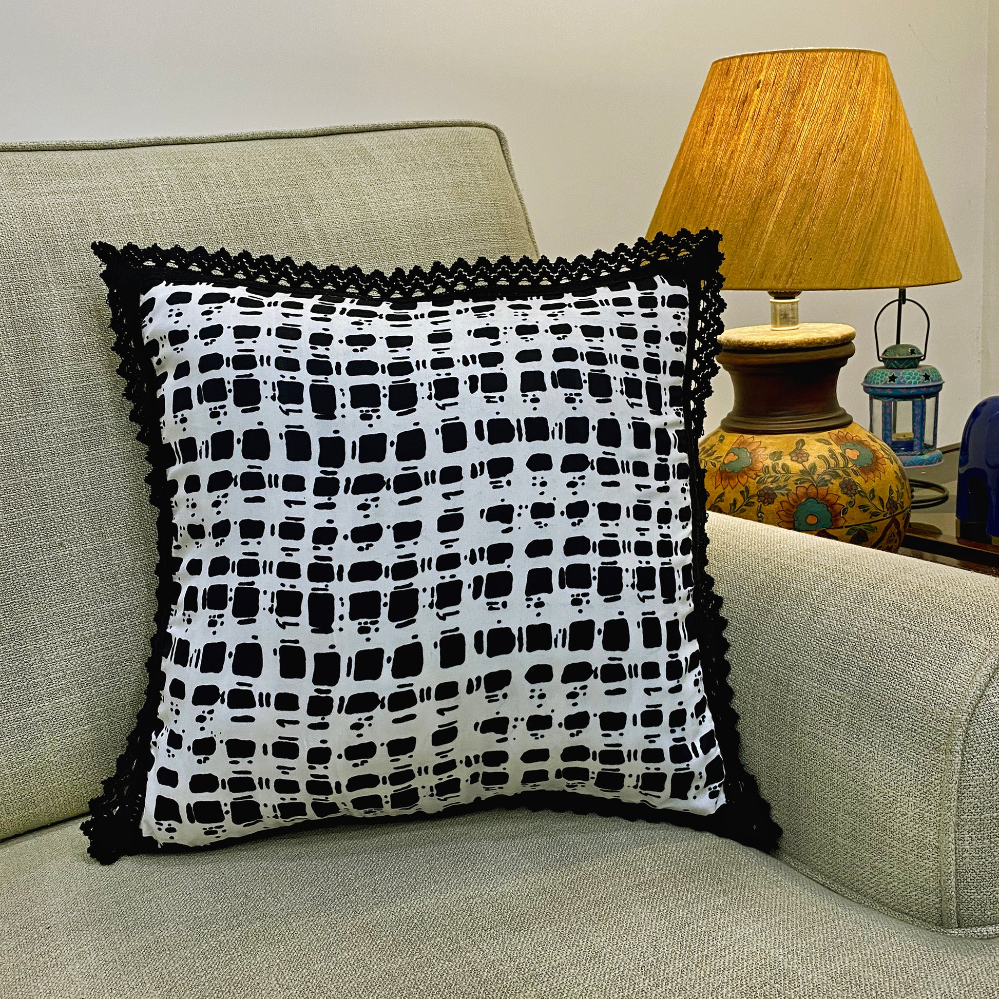 Add a dash of charm to your space with this Black & White Cushion Cover, featuring delicate lace detailing crafted on soft American crepe fabric. Its monochrome palette perfectly complements bohemian chic decor, bringing a stylish contrast to any room. Available in multiple sizes, with custom sizing options to fit your unique cushions—because your comfort deserves a playful twist!