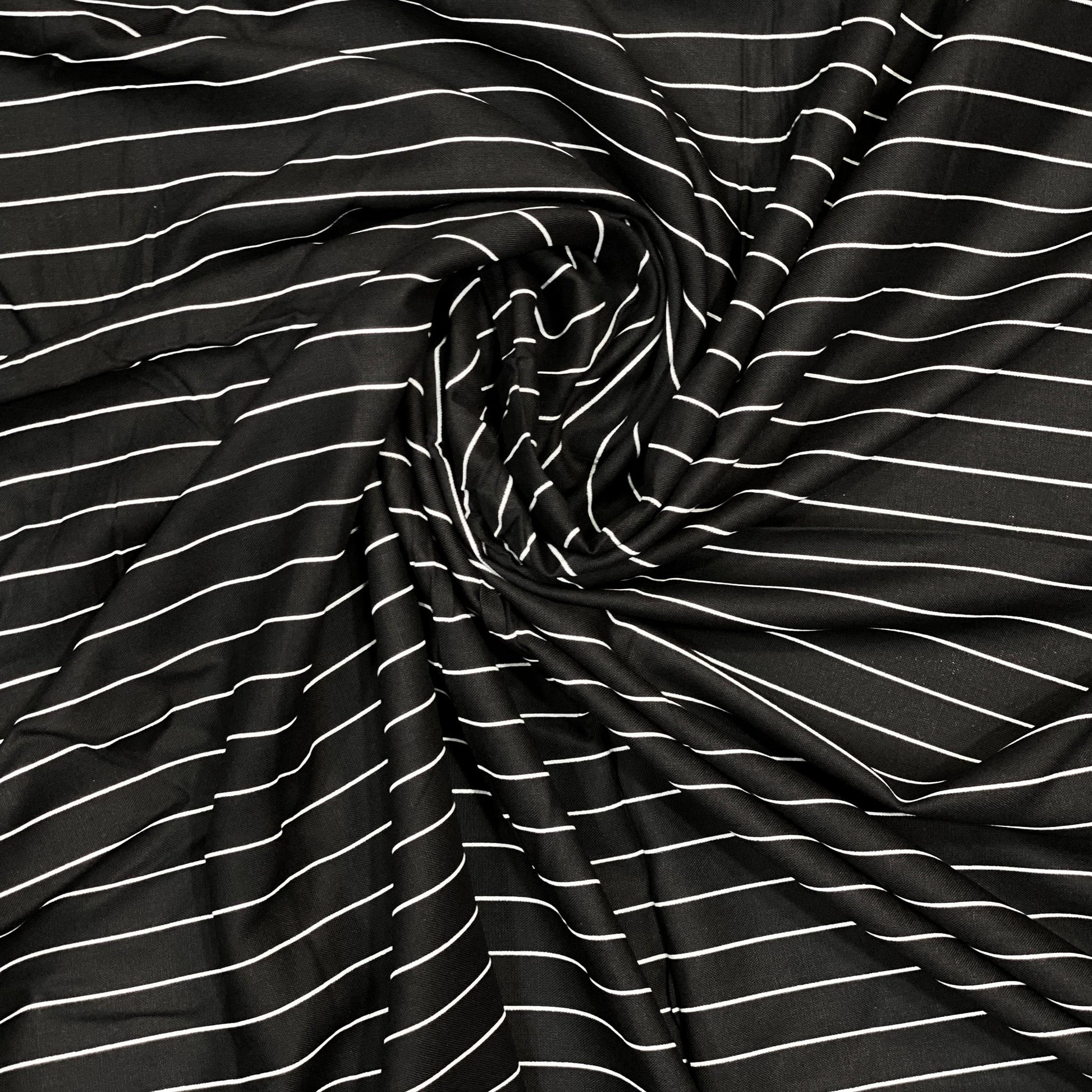 Elegant black and white striped print in softest cotton rayon fabric, perfect for office shirts, palazzos, night suits and more.