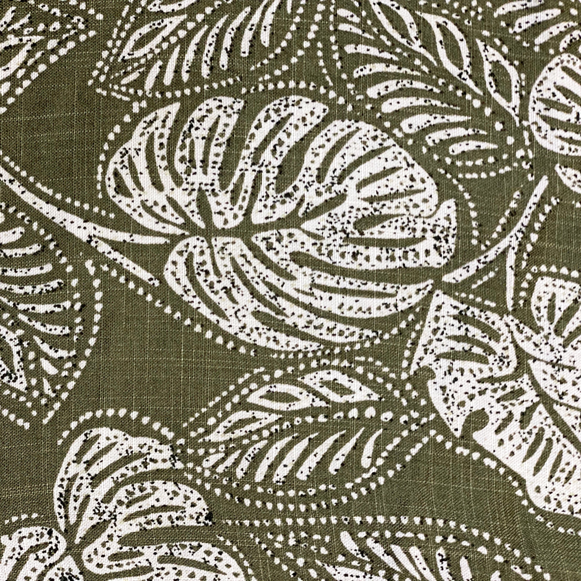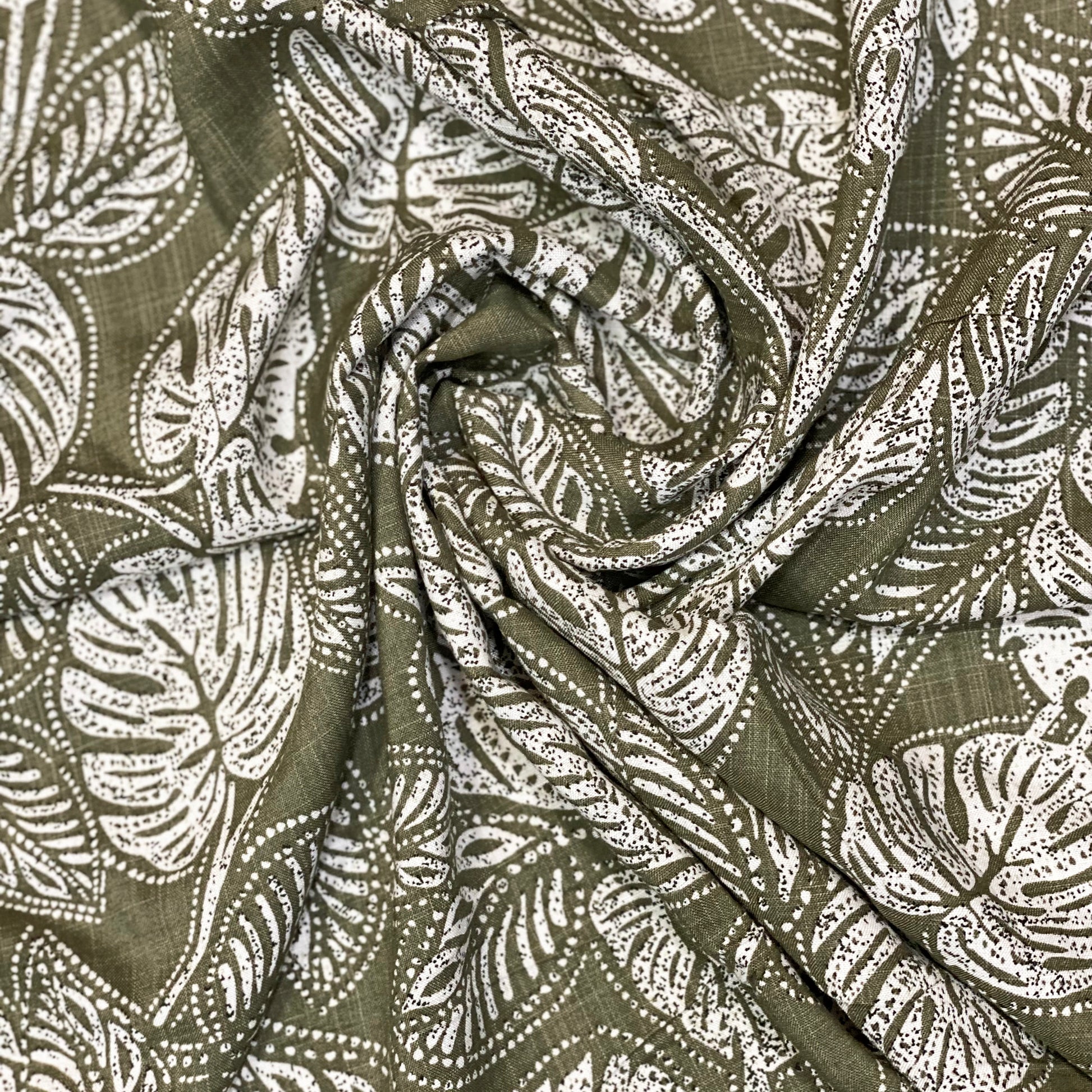 Bottle green soft rayon fabric with beautiful white monstera print all over.