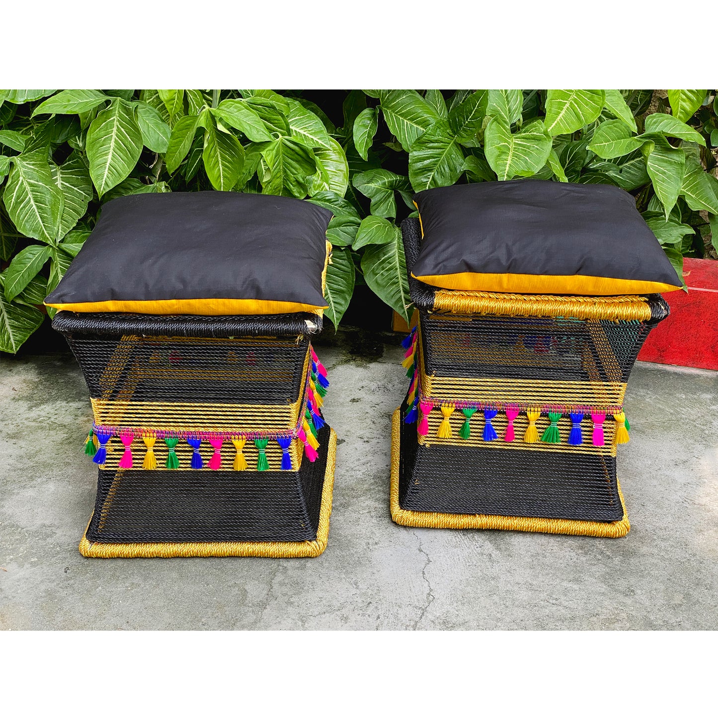 A light-weight embellished black rattan seat with complimentary dual hued cushions; woven using sturdy & butter soft nylon rope. Get this non pokey, utility seat to aesthetically add space and a nice festive element to your cosy home.