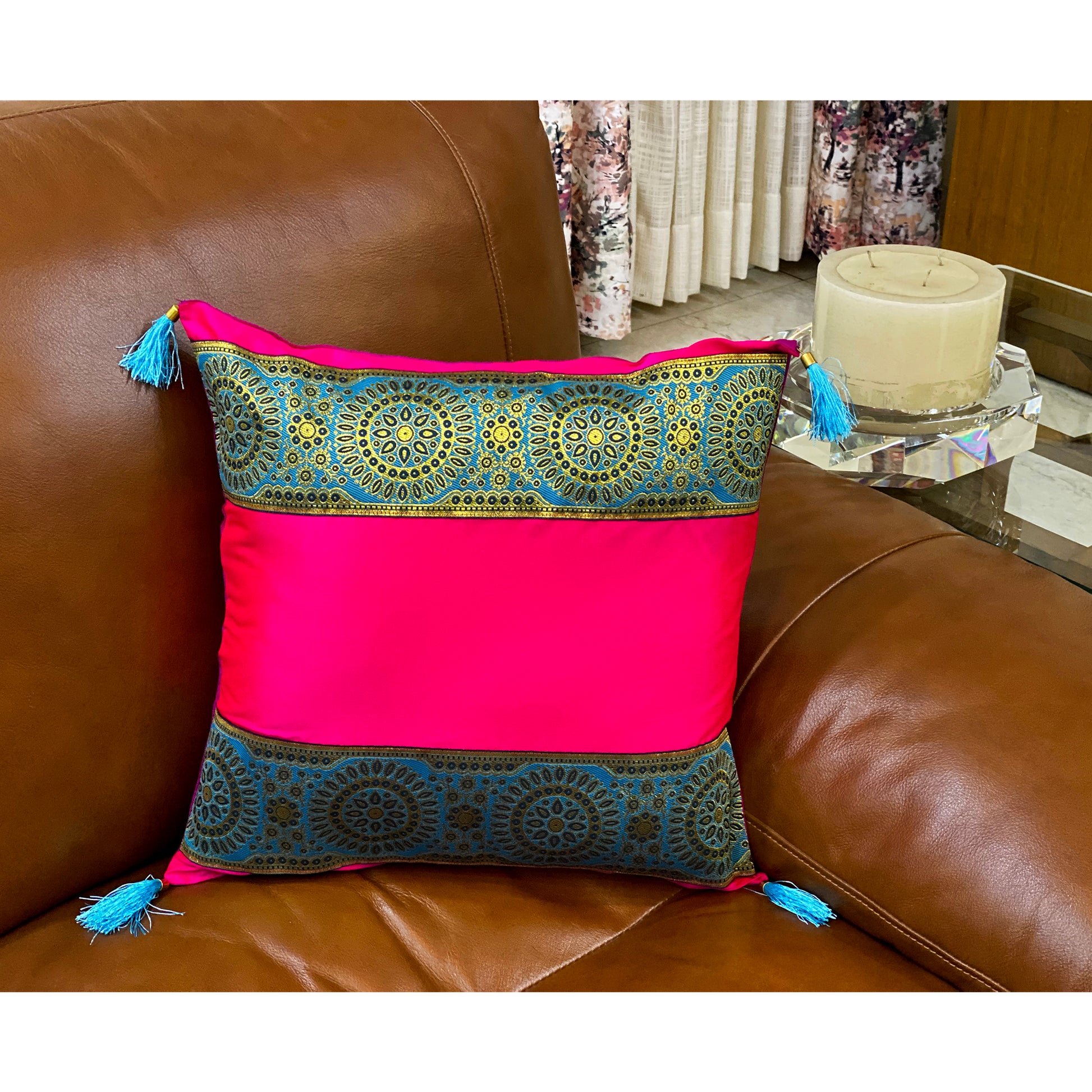 An absolute must have in a classy home .This cushion cover is made using premium raw silk and chennai silk fabrics, exuding total luxury and elegance. Available in a variety of sizes, this luxurious piece can make your home festival ready in no time. 15% OFF on First Purchase.