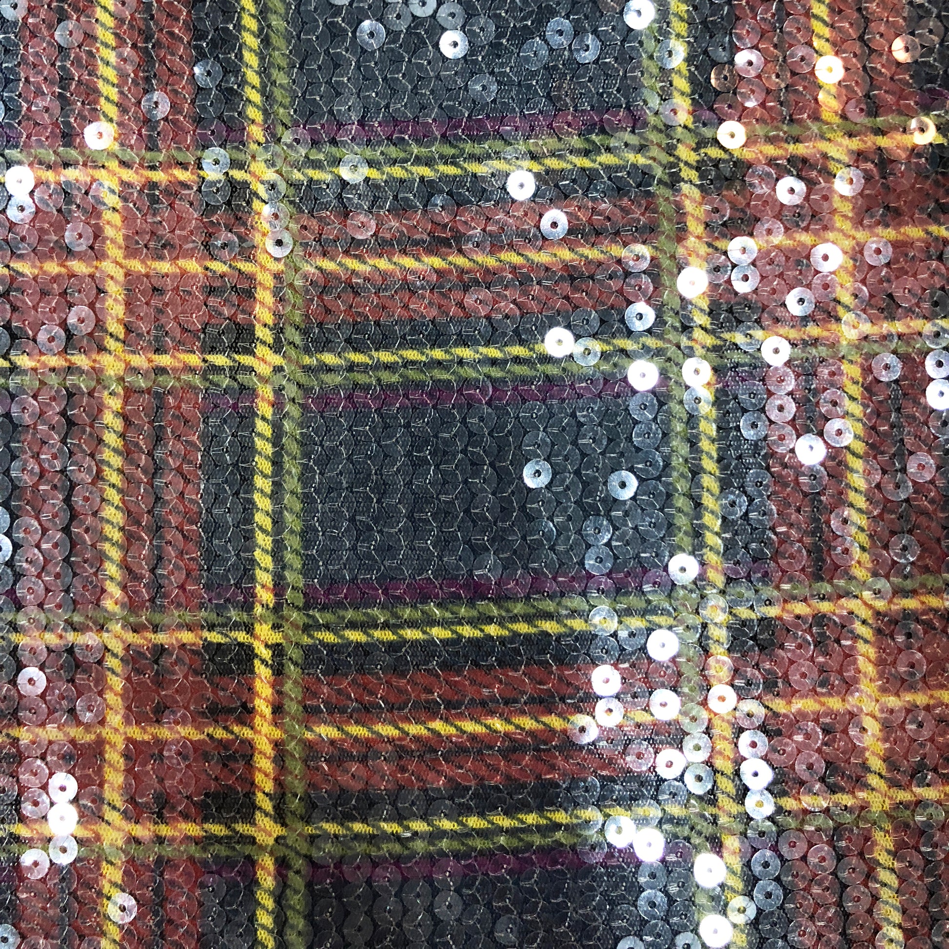 Net Fabric With Sequins And Check Print In Navy Blue, Red & Yellow.