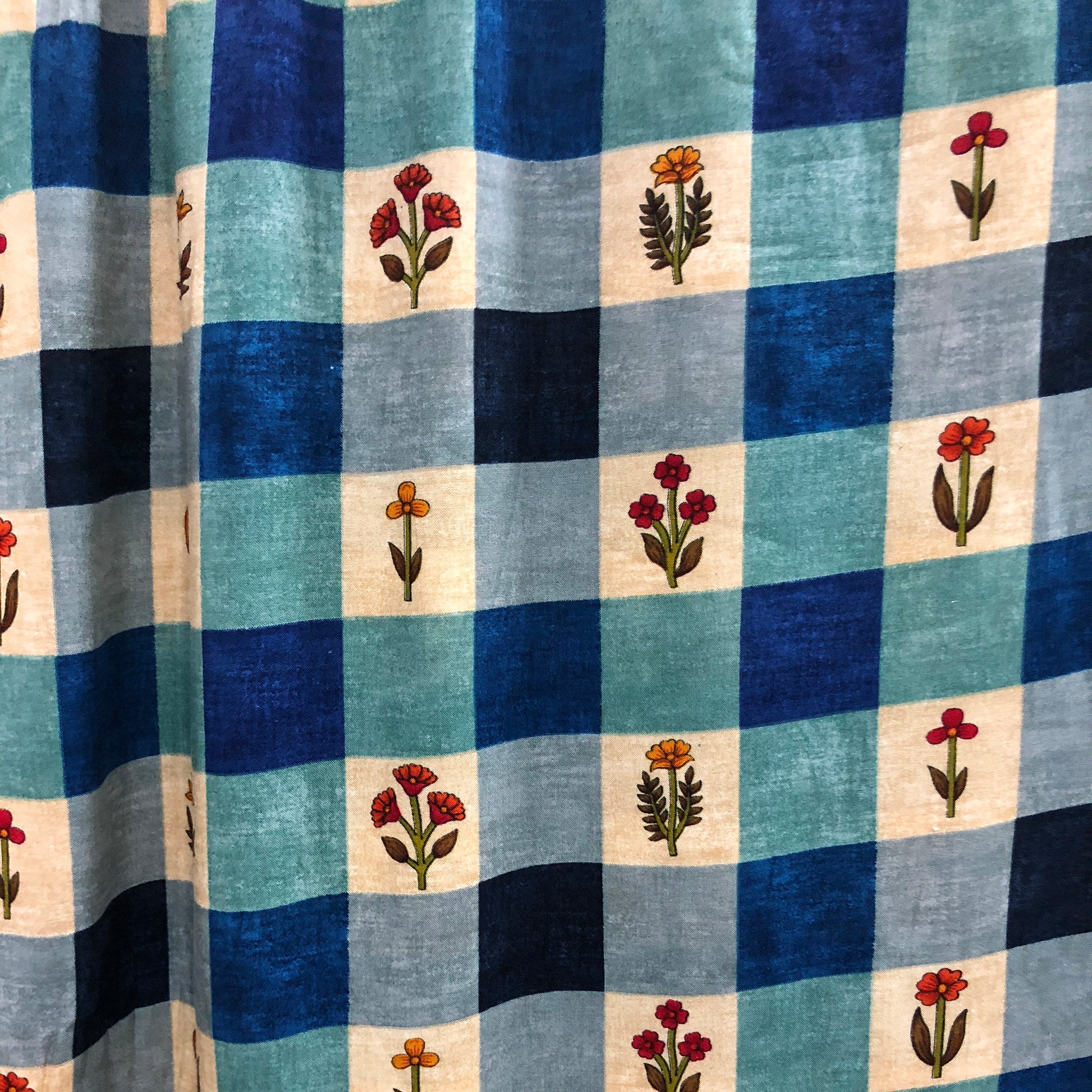An all time hit blue checkered print with yellow, rust & red flowers in rayon fabric. Stitch a a straight kurta or make a beautiful table runner with contrast piping and enjoy a happy meal!