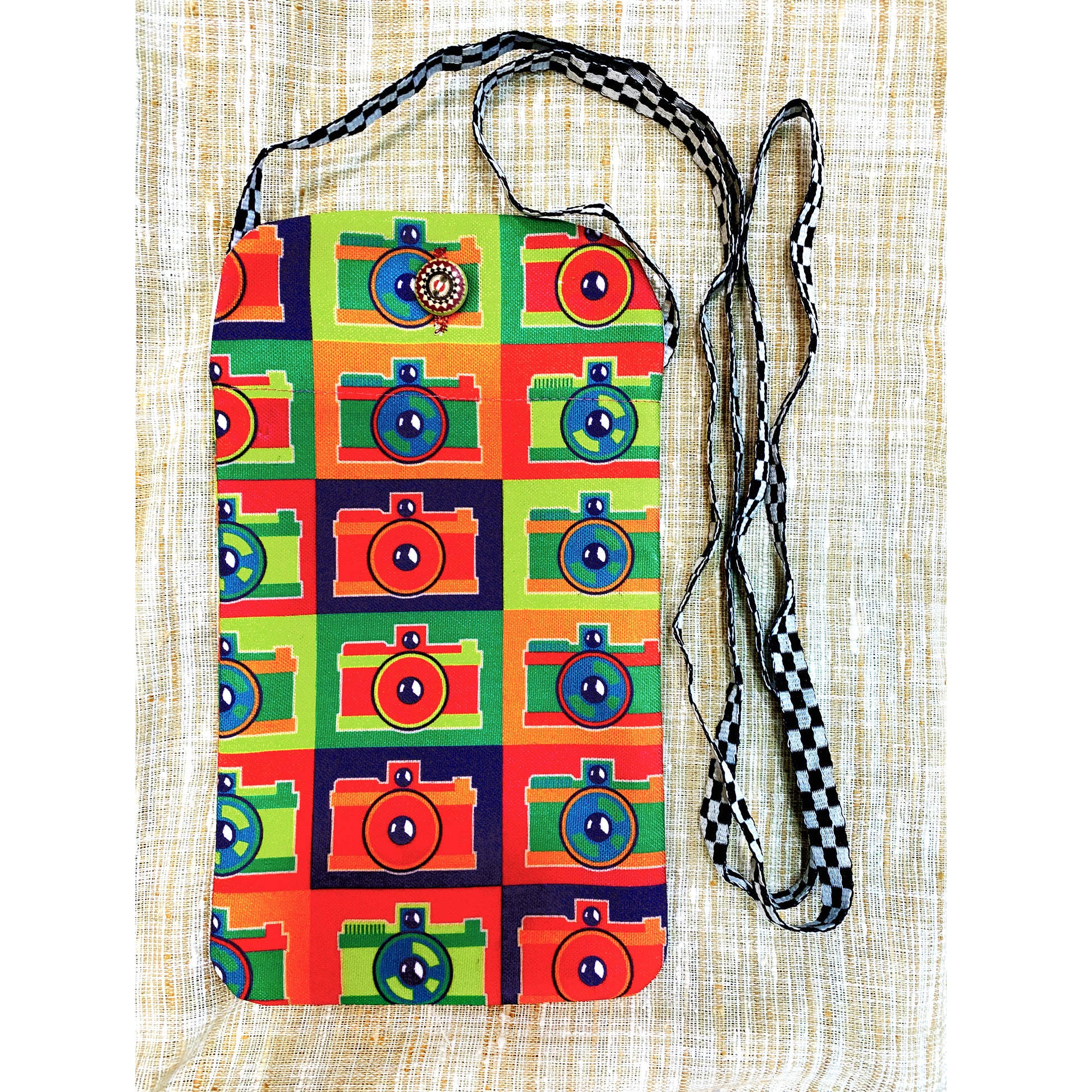 Spectacles print utility pouch; for travelling, evening walks or quick trips to the convenience store. This practical to-go-bag comes with a sling and easily accommodates your cell-phone, cards, i-pod, cash , some tissues and earphones. Now walk hands-free with this light-weight fabric pouch made in India.
