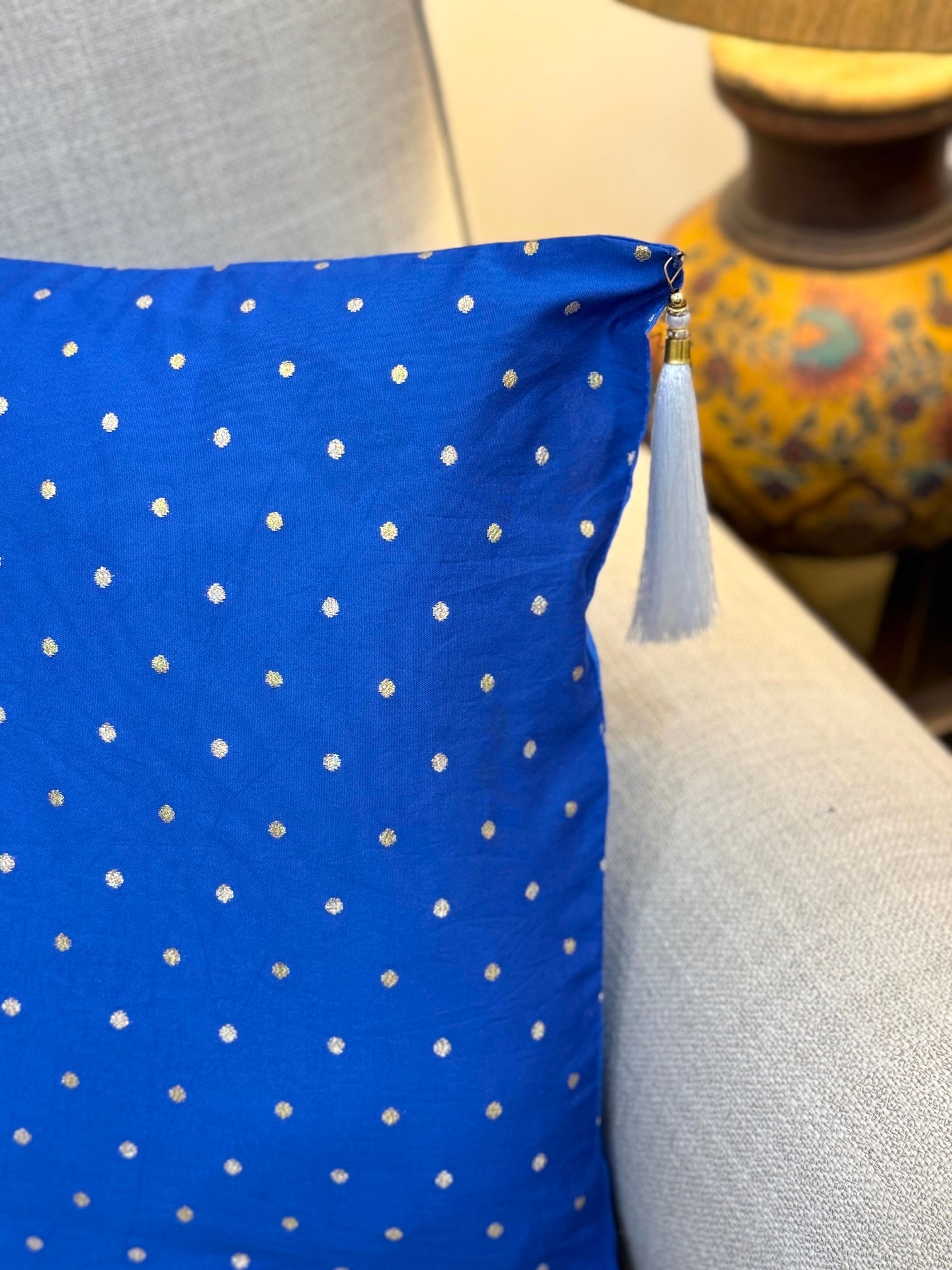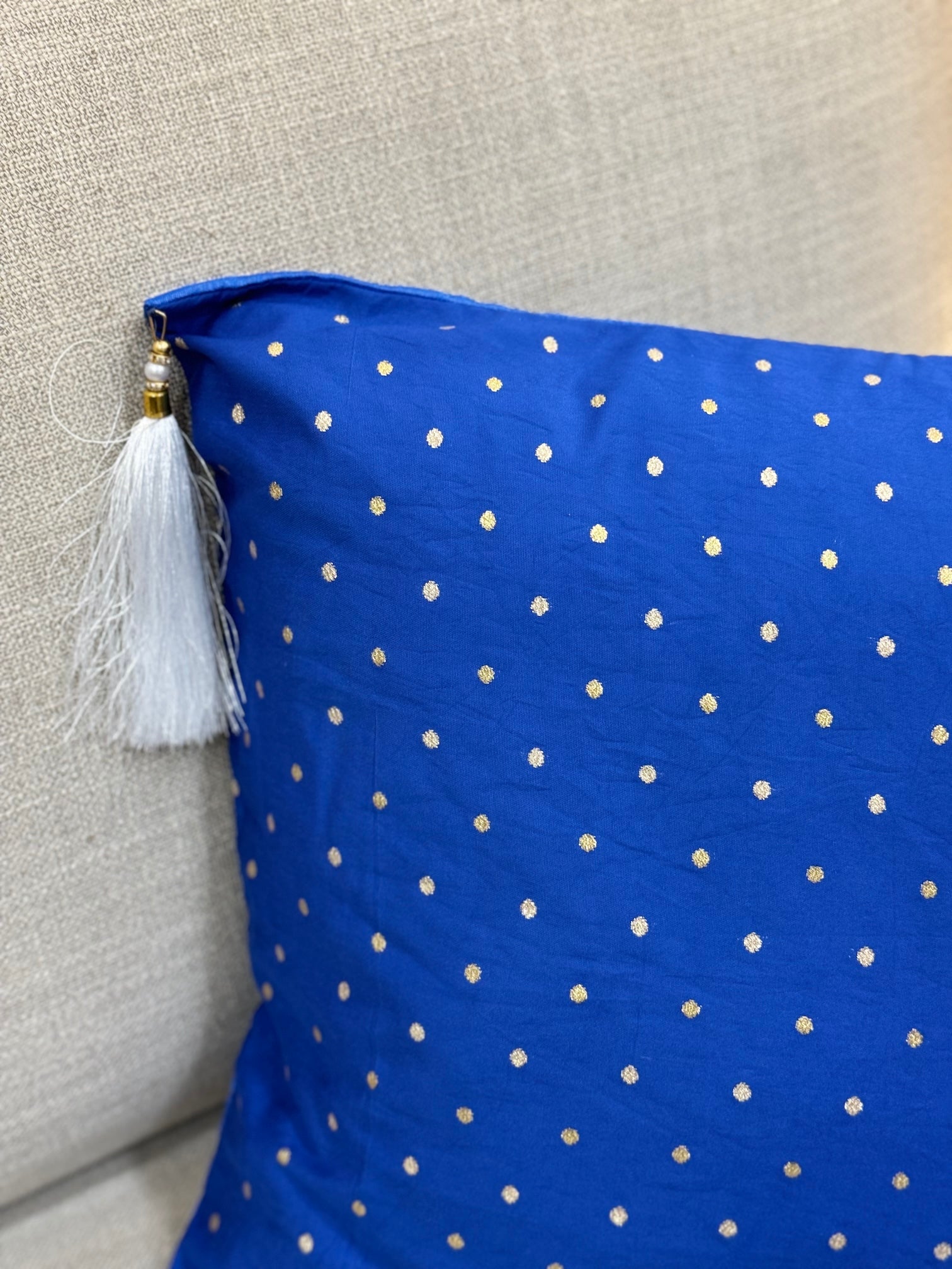 Subtle elegance meets bold colour ✨ Our elegant blue silk cushion cover with beautiful white tassels, adds a perfect touch of sophistication to any space. A classic statement for the Indie home. Available in multiple sizes to choose from, you can get a custom size made too. Just shoot us a mail with your specifications and we'll do the rest.