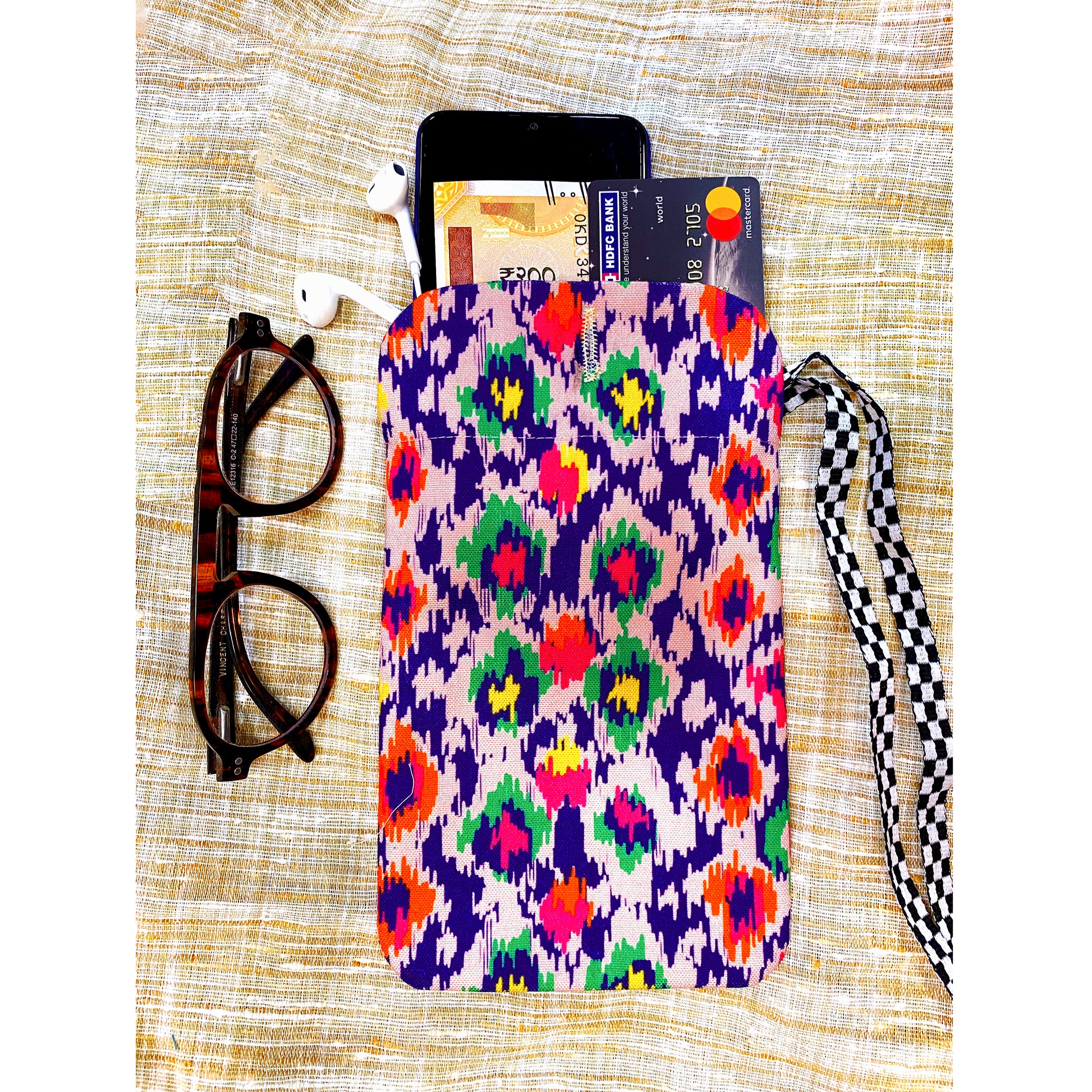 Cute & super vibrant utility pouch with beautiful button closure for holidays, festivals, short meetings, evening walks or quick trips to the convenience store. This practical to-go-bag comes with long strap and easily accommodates your cell-phone, cards, cash , some tissues and earphones. Now walk hands-free with this light-weight fabric pouch made in India.