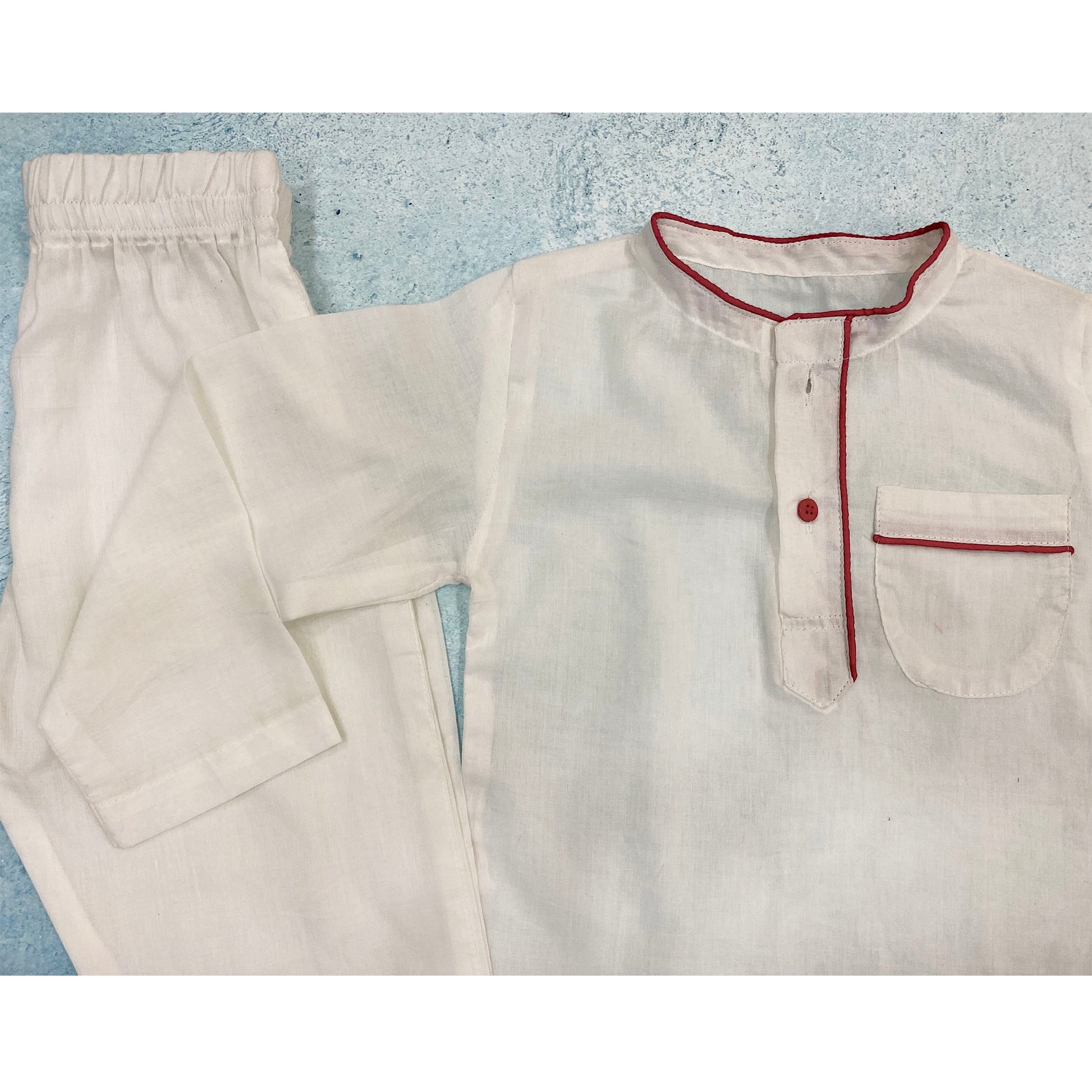 Classic White Kurta Pajama outfit with red thin piping for baby boys in softest cotton mul fabric from 6 months to 8 years.