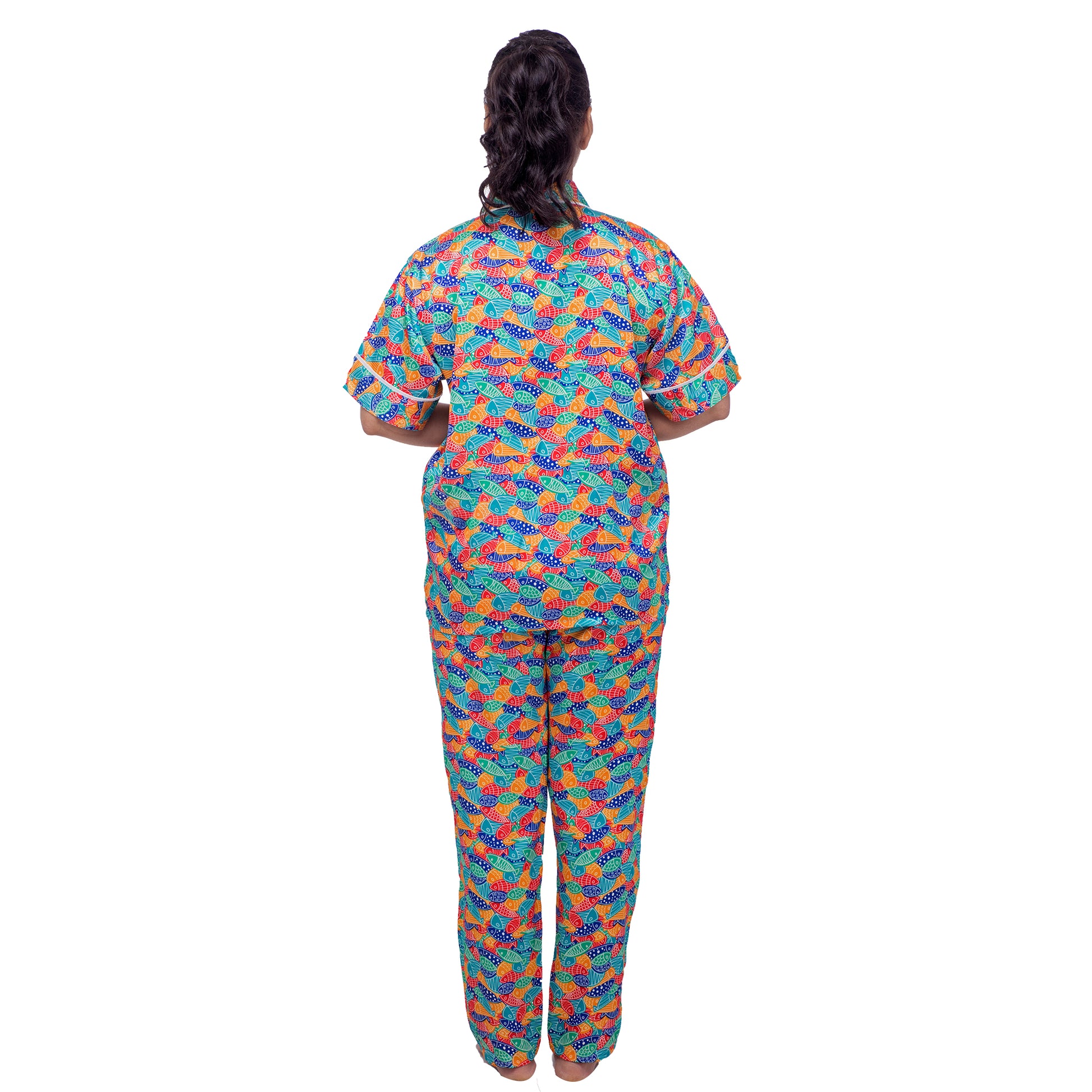 A vibrant fish print night-suit with cute pockets in luxurious satin. Don't see your size? Send us your measurements in the notes during checkout to get a custom-made fit right at your doorstep.