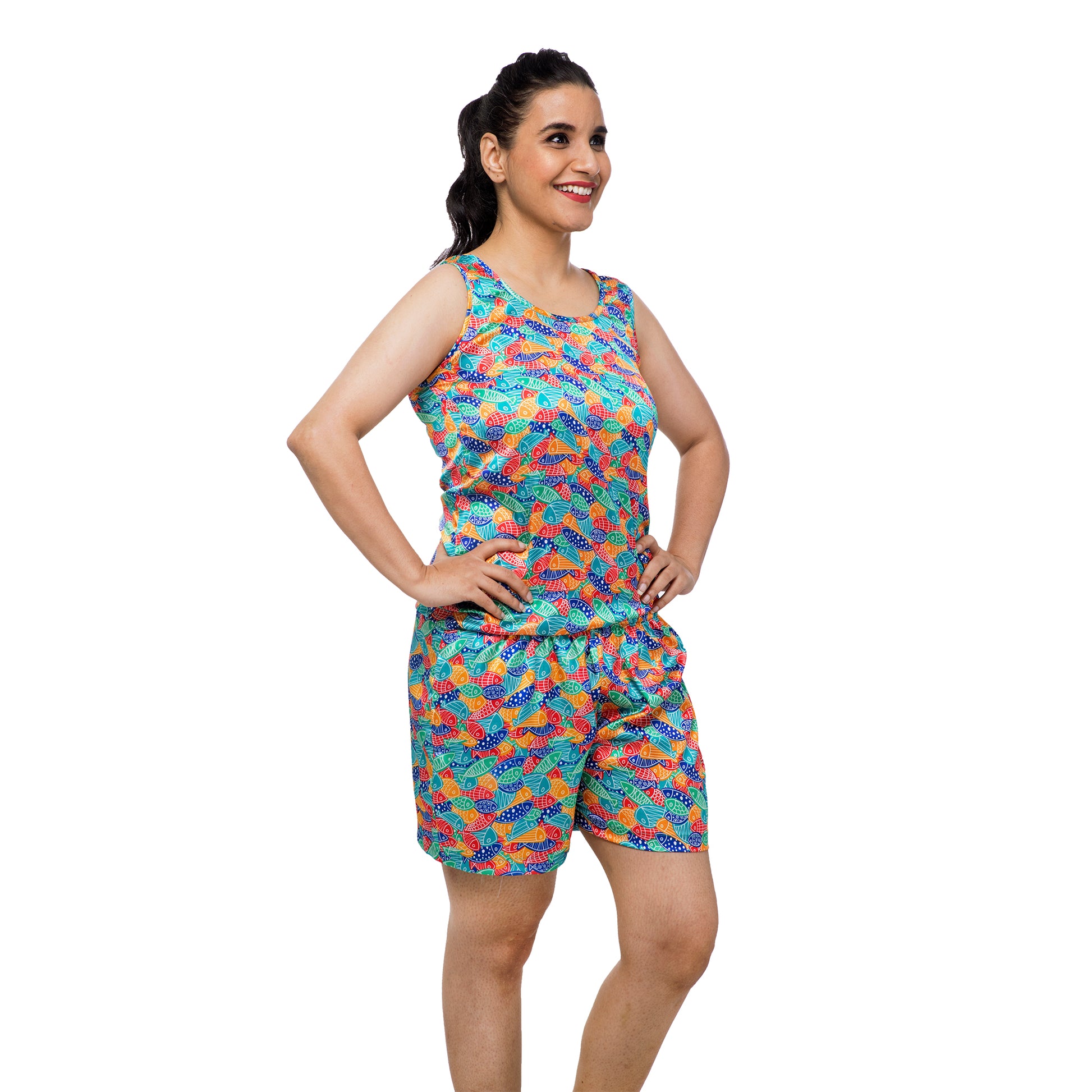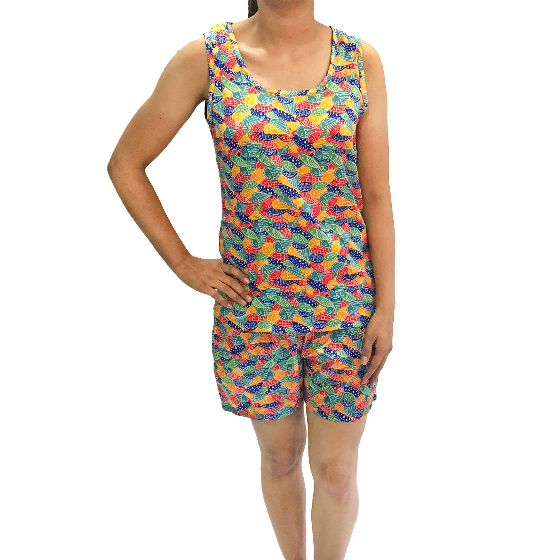 A luxurious soft satin pair of boxers with a lively fish print. Wear it with a black lacy top or with the matching tank top for a whole night suit look.