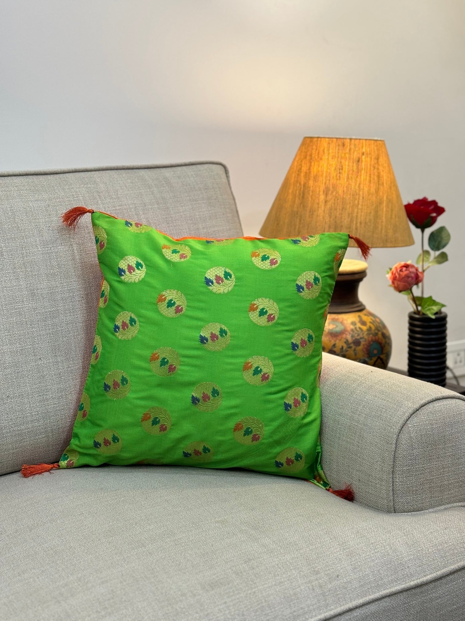 Enhance your stylish home with this elegant green brocade cushion cover, featuring a delicate and intricate pattern. The rich green hue adds a fresh, sophisticated touch, while the fine brocade detailing brings an air of subtle luxury. Perfect for modern and traditional settings, this cushion cover effortlessly elevates your decor with timeless charm.