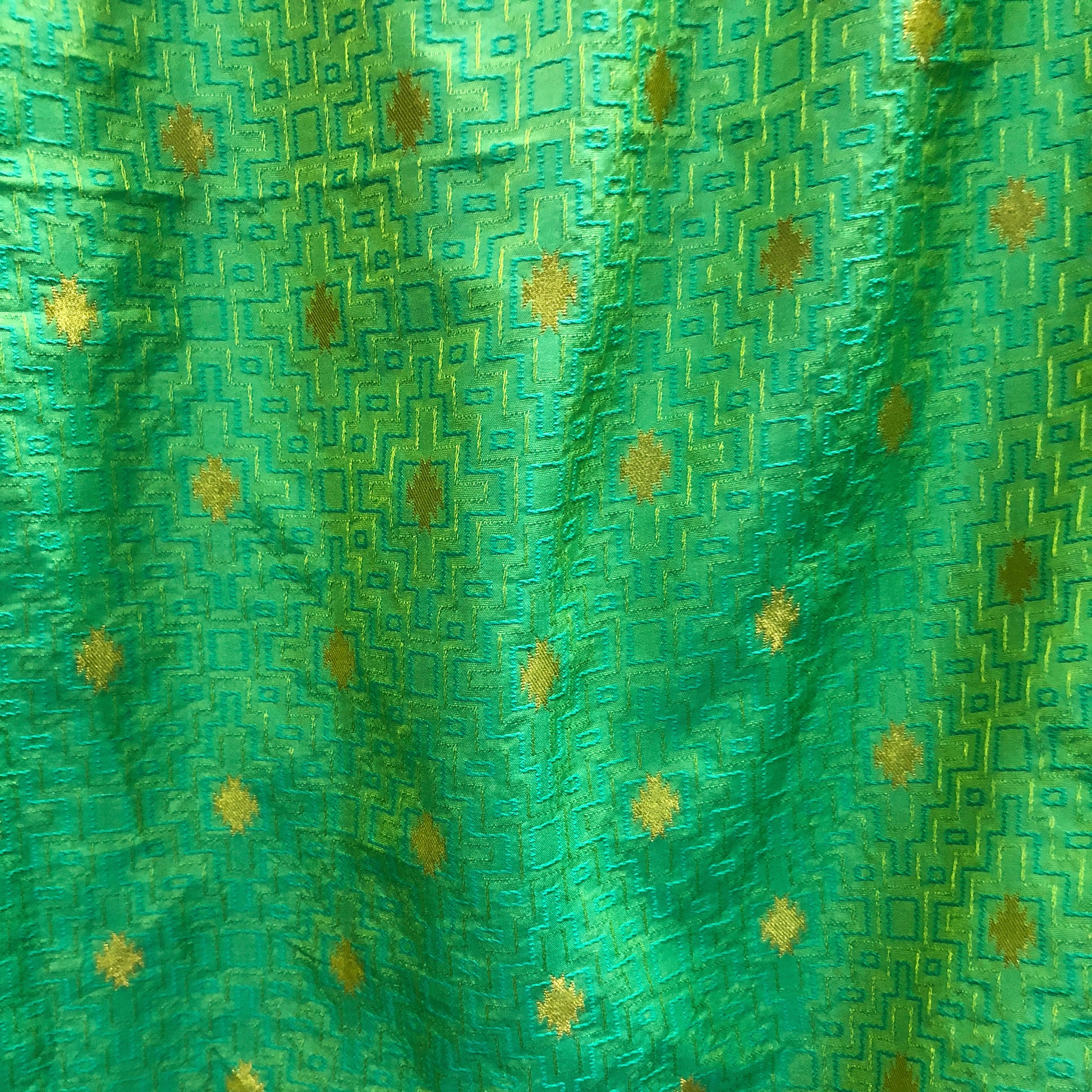 A vibrant and luxurious green brocade fabric. Make a chic summer dress or a beautiful straight kurta in this absolutely traditional print.