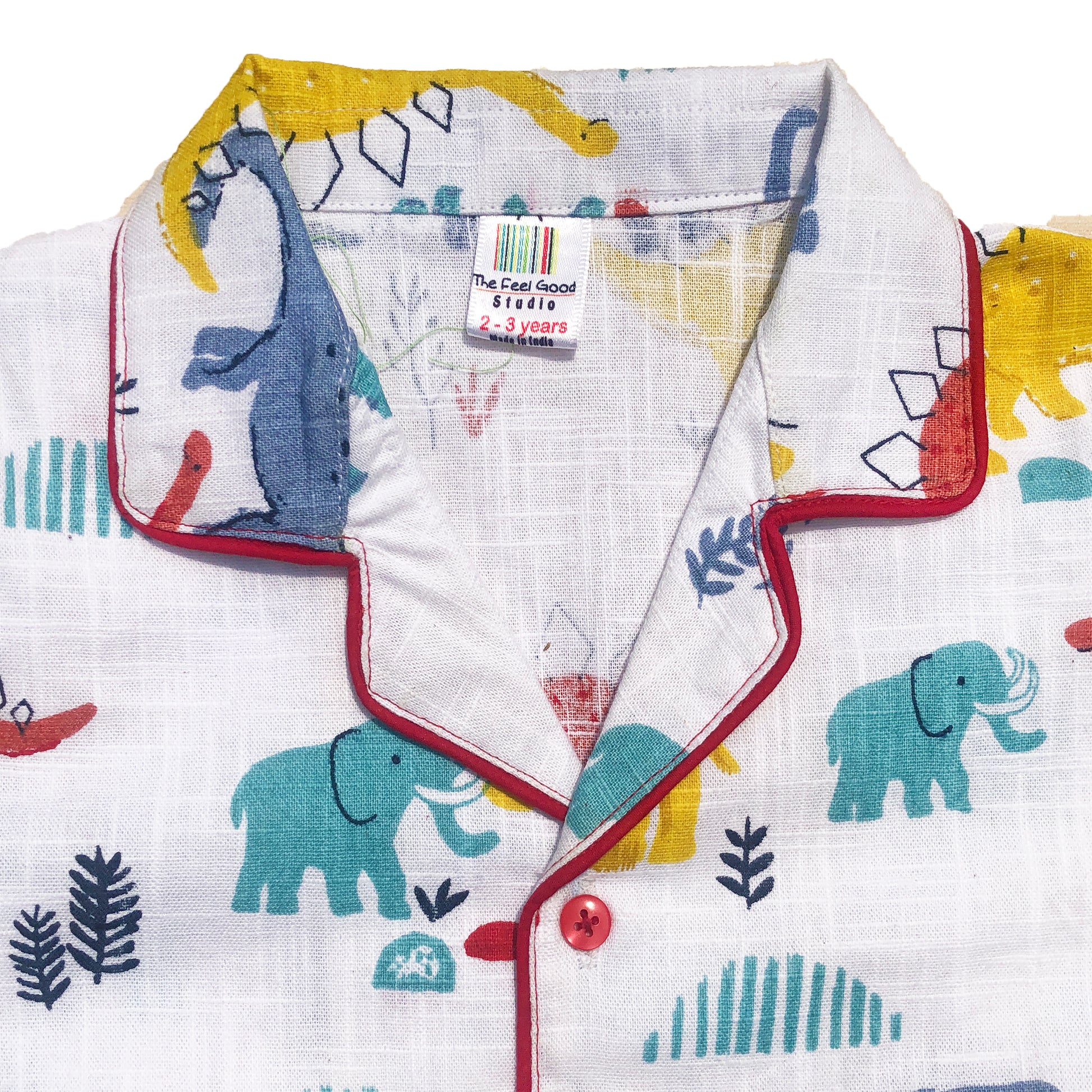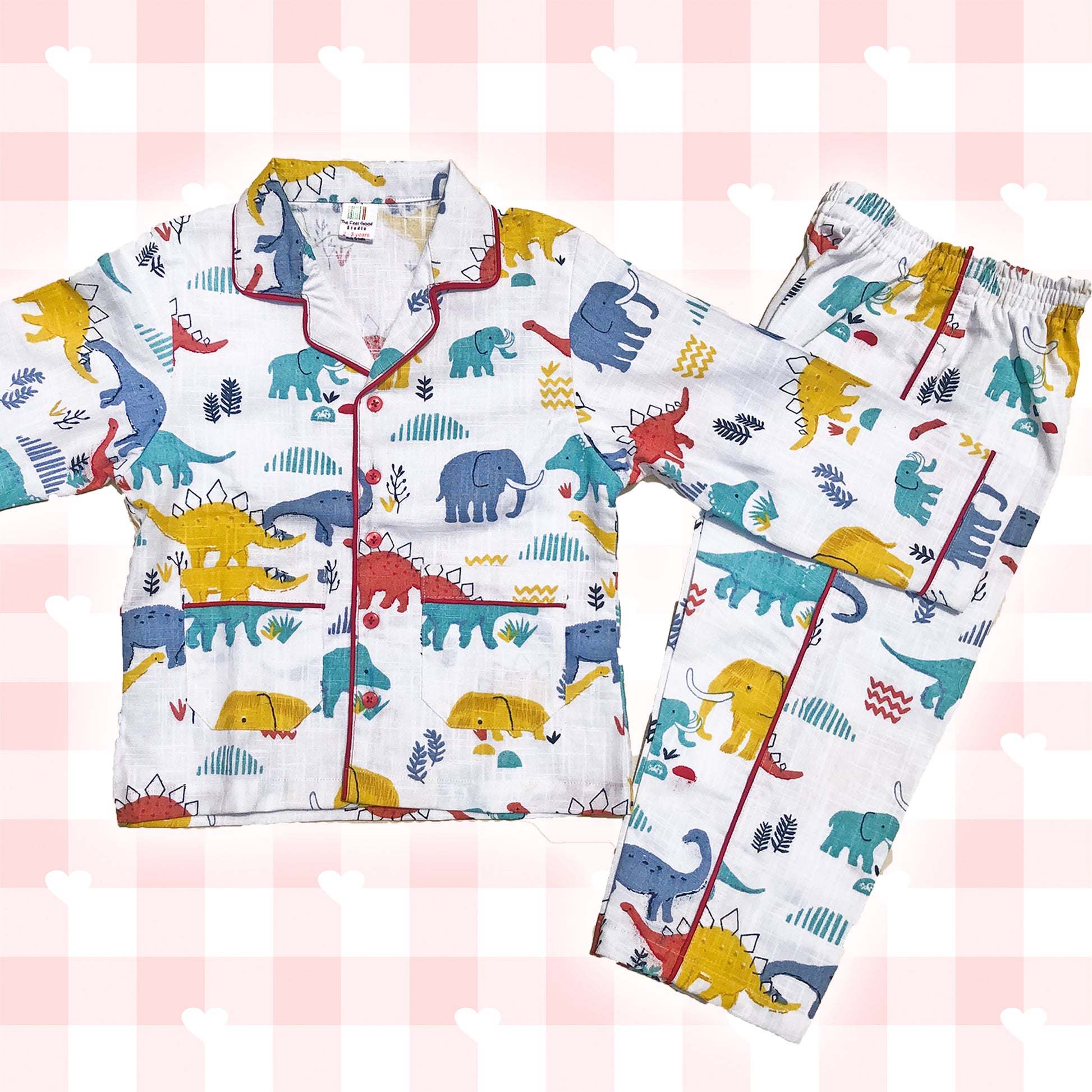 Colourful Dinosaur print night suit on light cotton fabric. It comes with a practical button roll up feature in all pajamas till the age of 5.