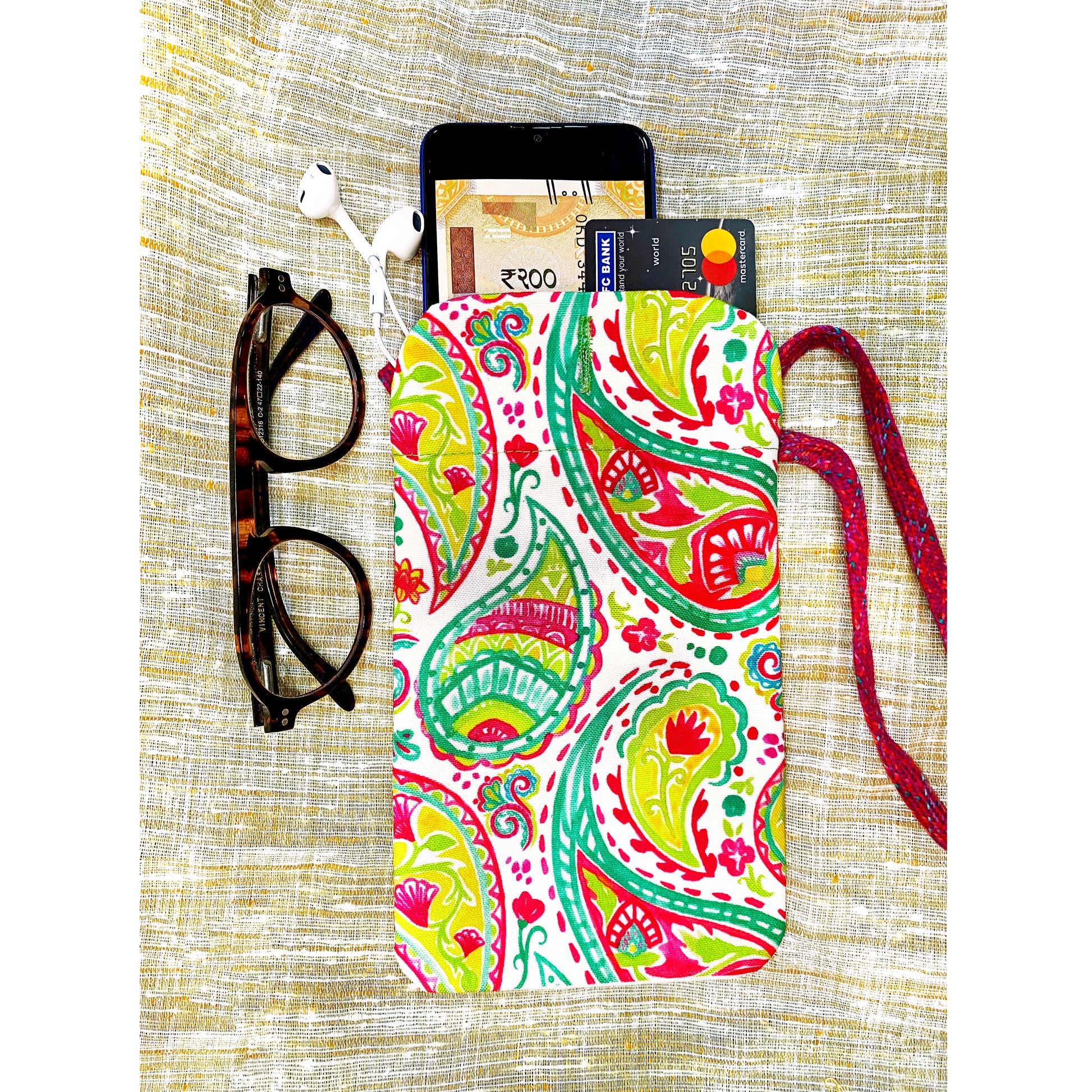 Cute and vibrant paisleys print utility pouch with beautiful button closure for music festivals, short meetings, all those evening walks or quick trips to the convenience store. This practical to-go-bag comes with long strap and easily accommodates your cell-phone, cards, i-pod, cash , some tissues and earphones. Now walk hands-free with this light-weight fabric pouch made in India.