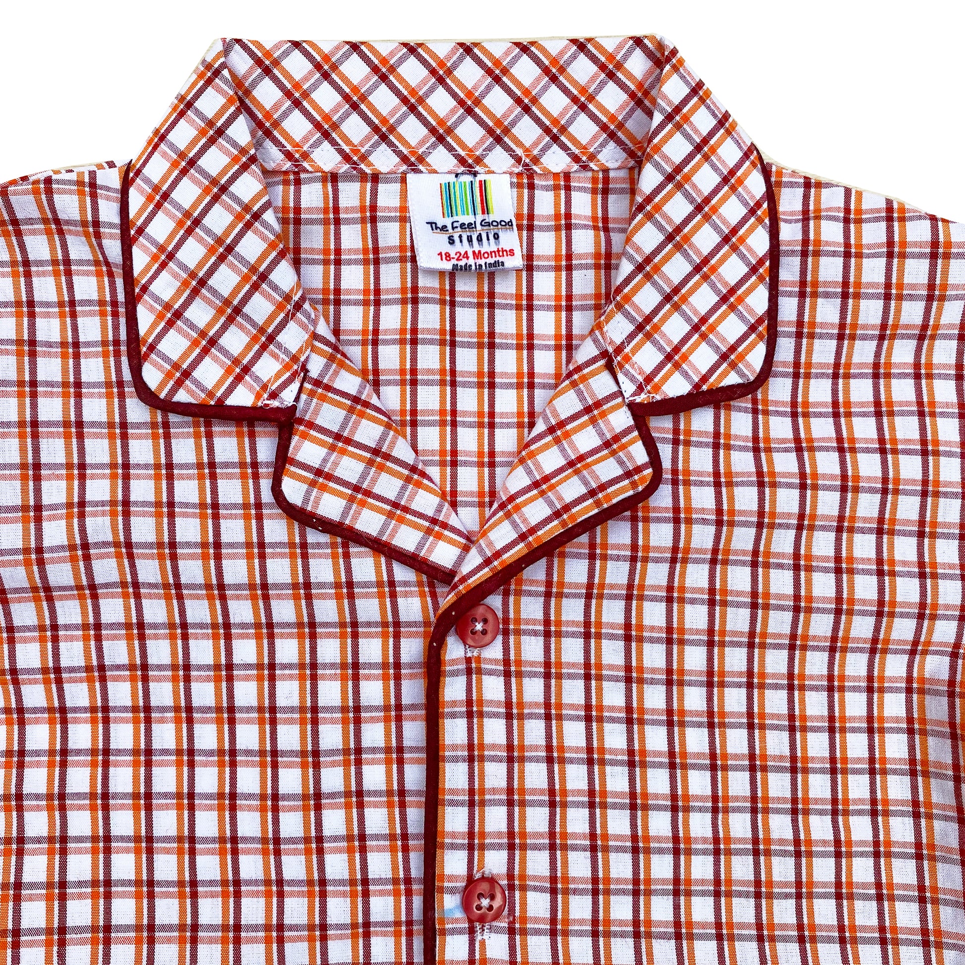 Maroon and Orange Checkered print night suit on softest cotton fabric. It comes with a practical button roll up feature in all pajamas till the age of 5 which helps in effectively adjusting the length of the bottoms for a couple of years without worrying about them growing up too fast.