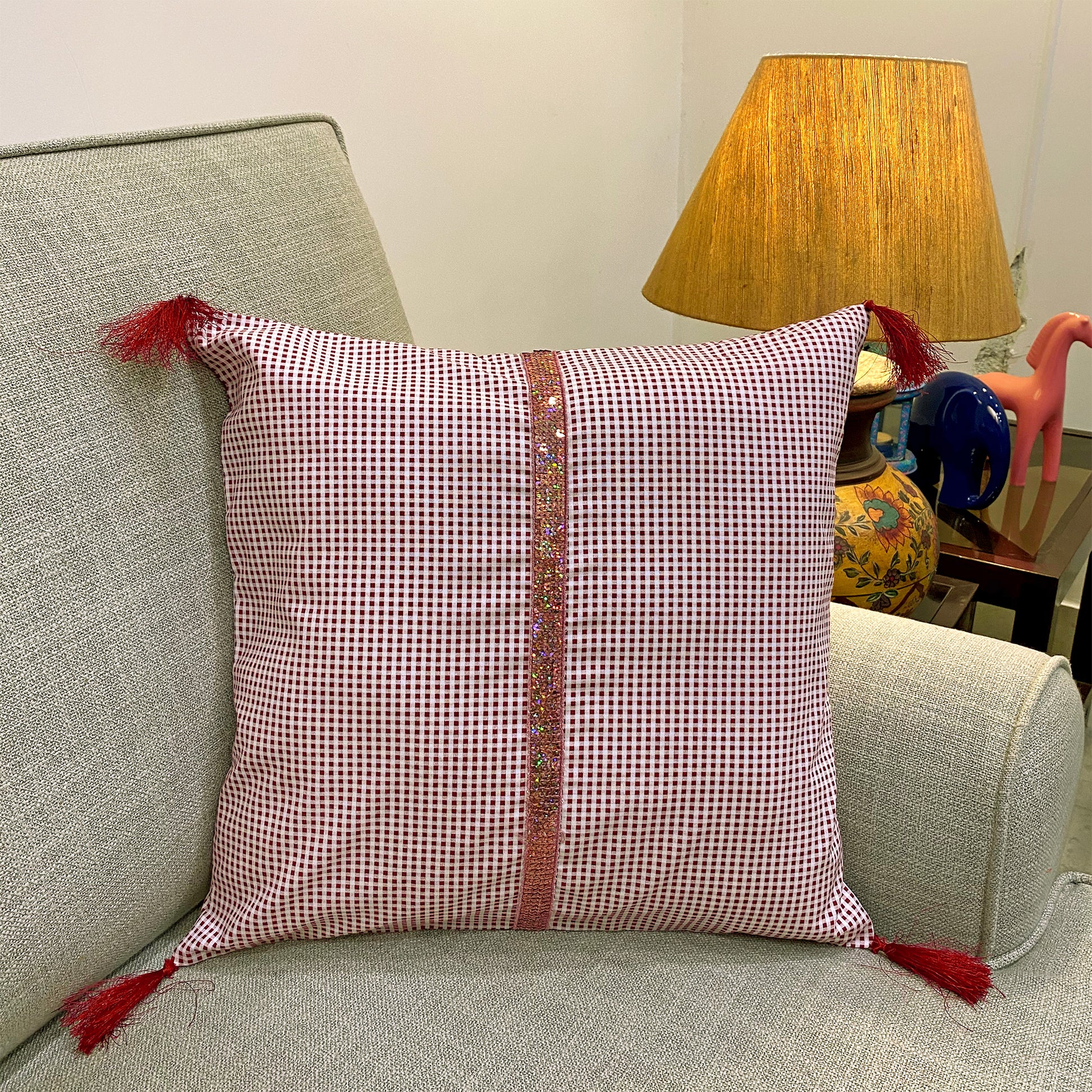Minimalistic yet modern light mauve cushion cover with delicate lacework.