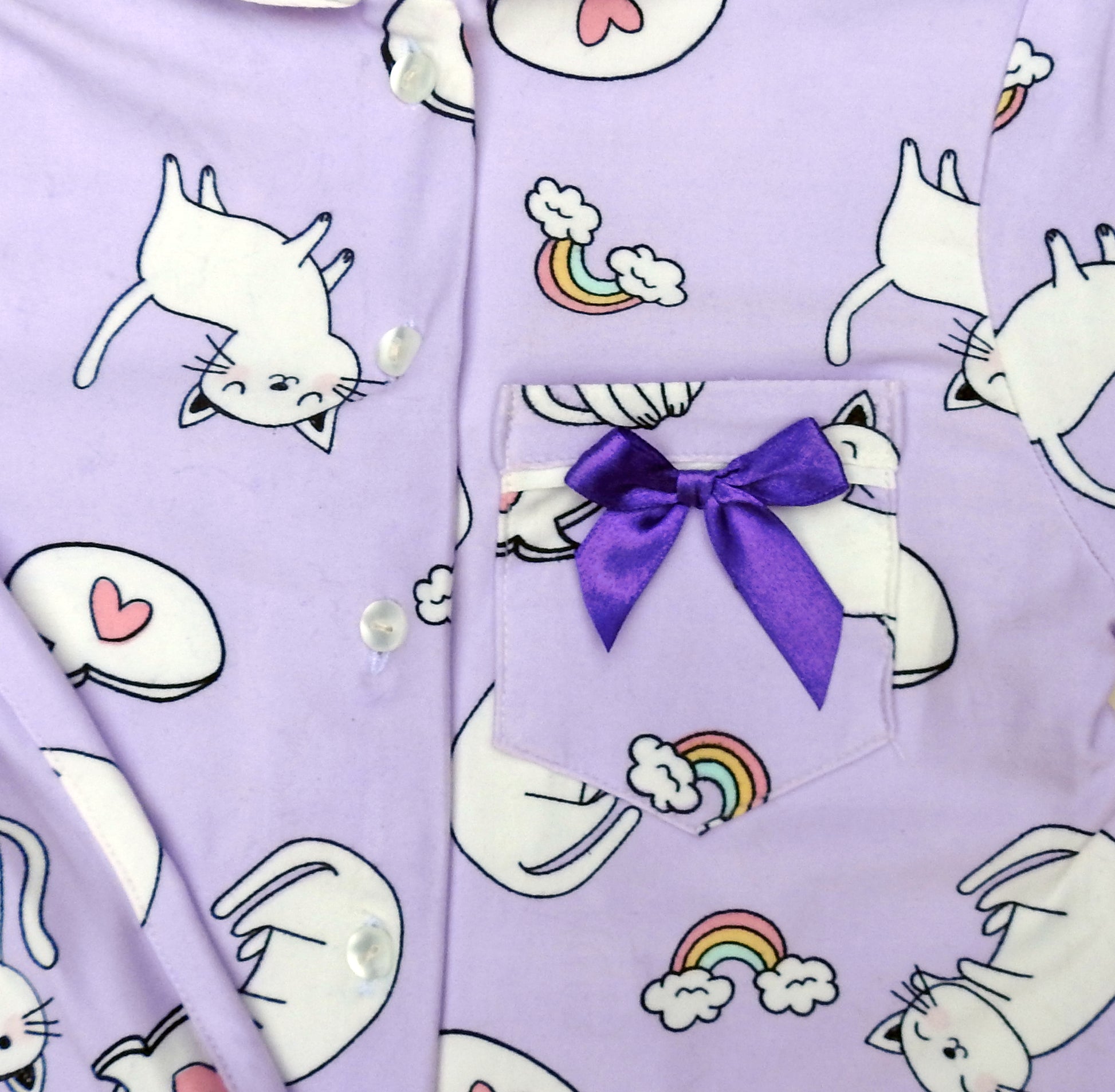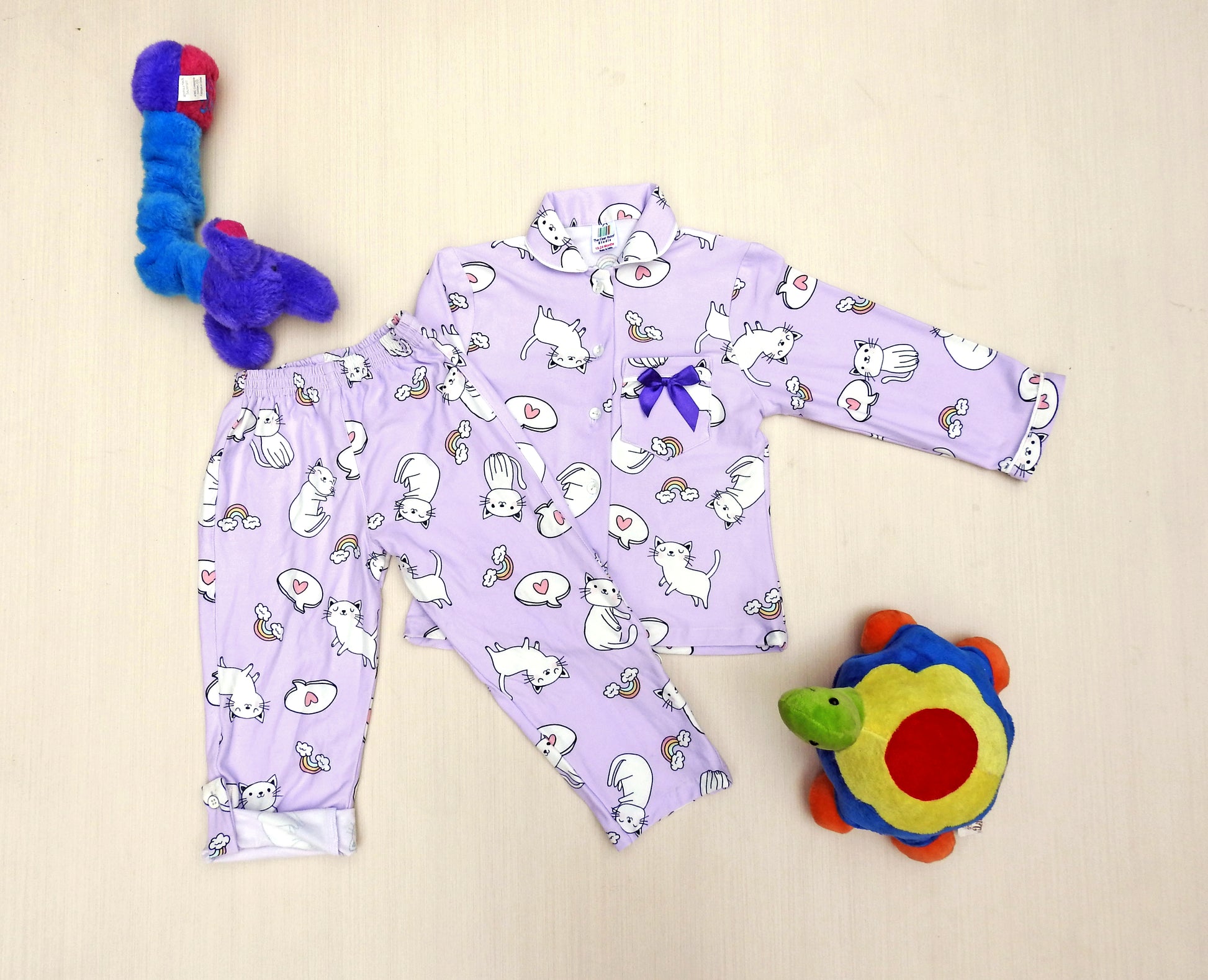 A super cute cat print nightsuit for your little one in soft butter cotton fabric. It comes with a practical button roll up feature in all pajamas.