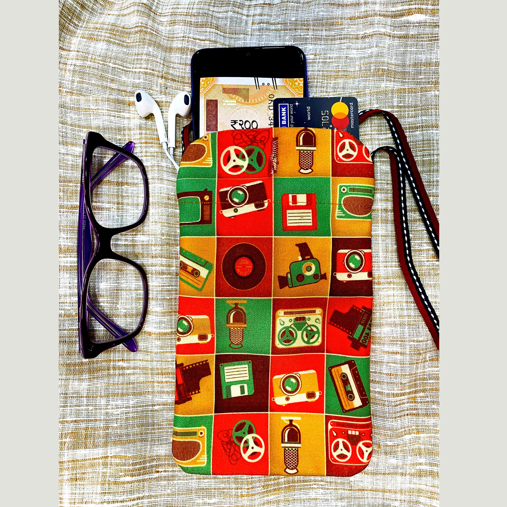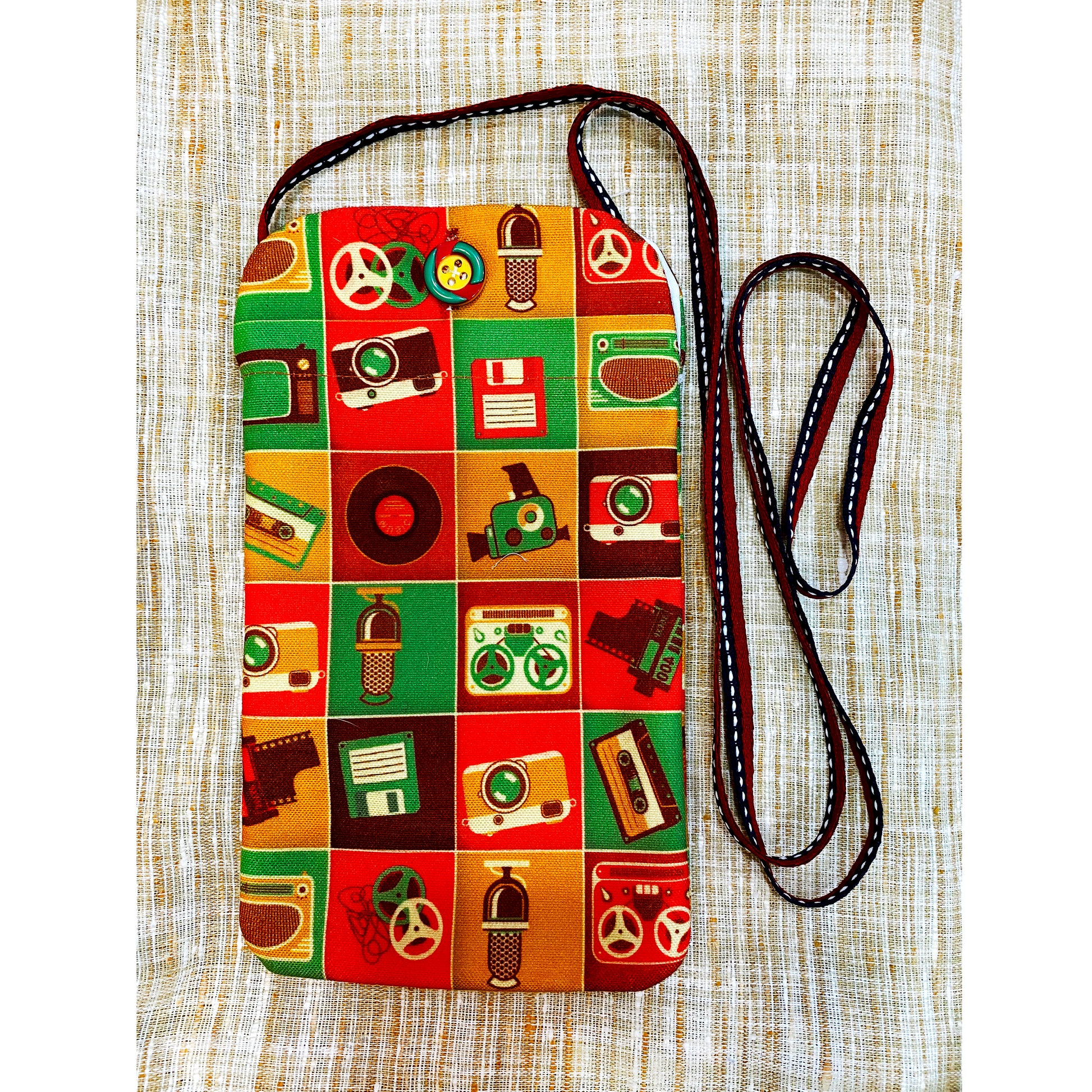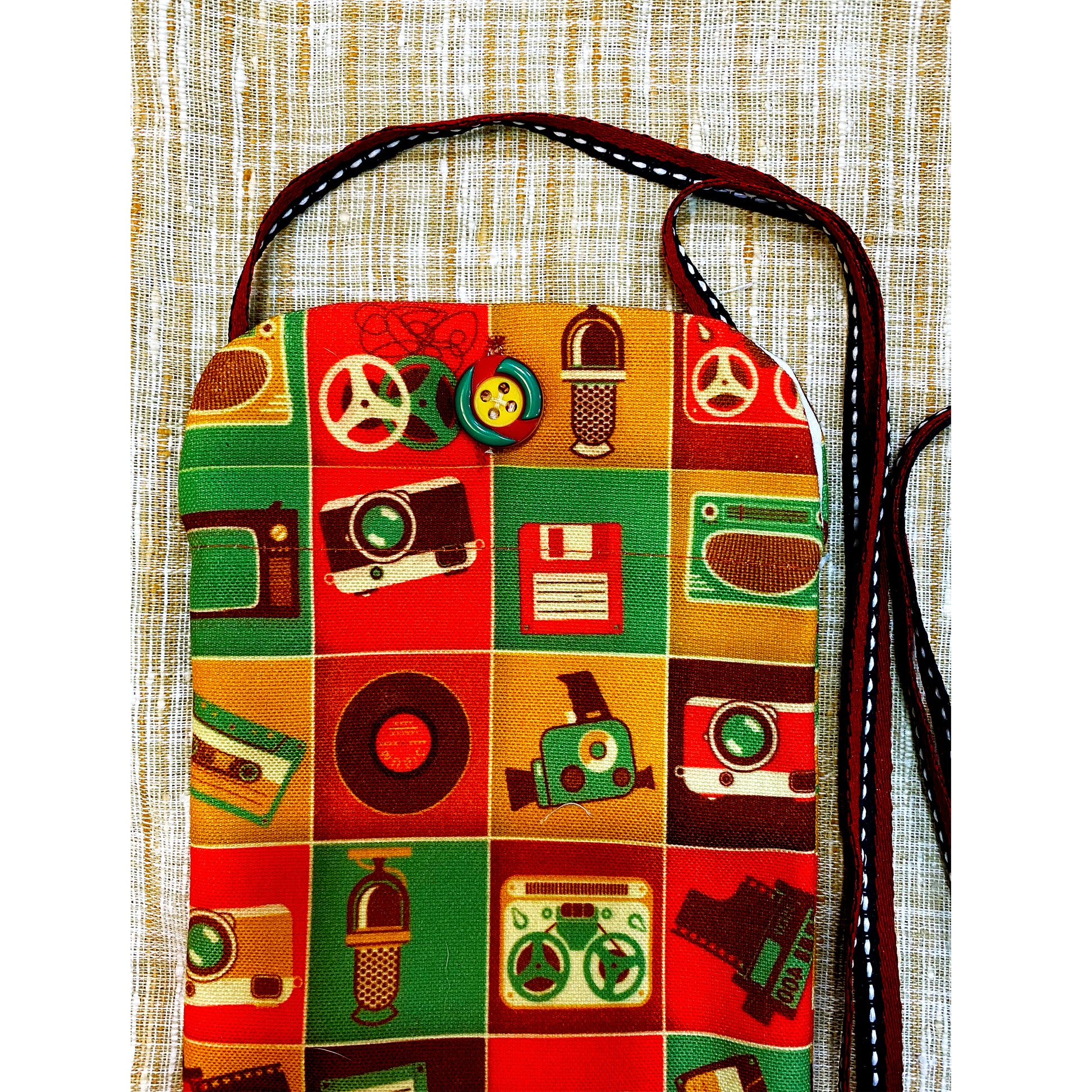 Media themed music gig utility pouch with beautiful button closure for festivals, short meetings, evening walks or quick trips to the convenience store. This practical to-go-bag comes with long strap and easily accommodates your cell-phone, cards, i-pod, cash , some tissues and earphones. Now walk hands-free with this light-weight fabric pouch made in India.