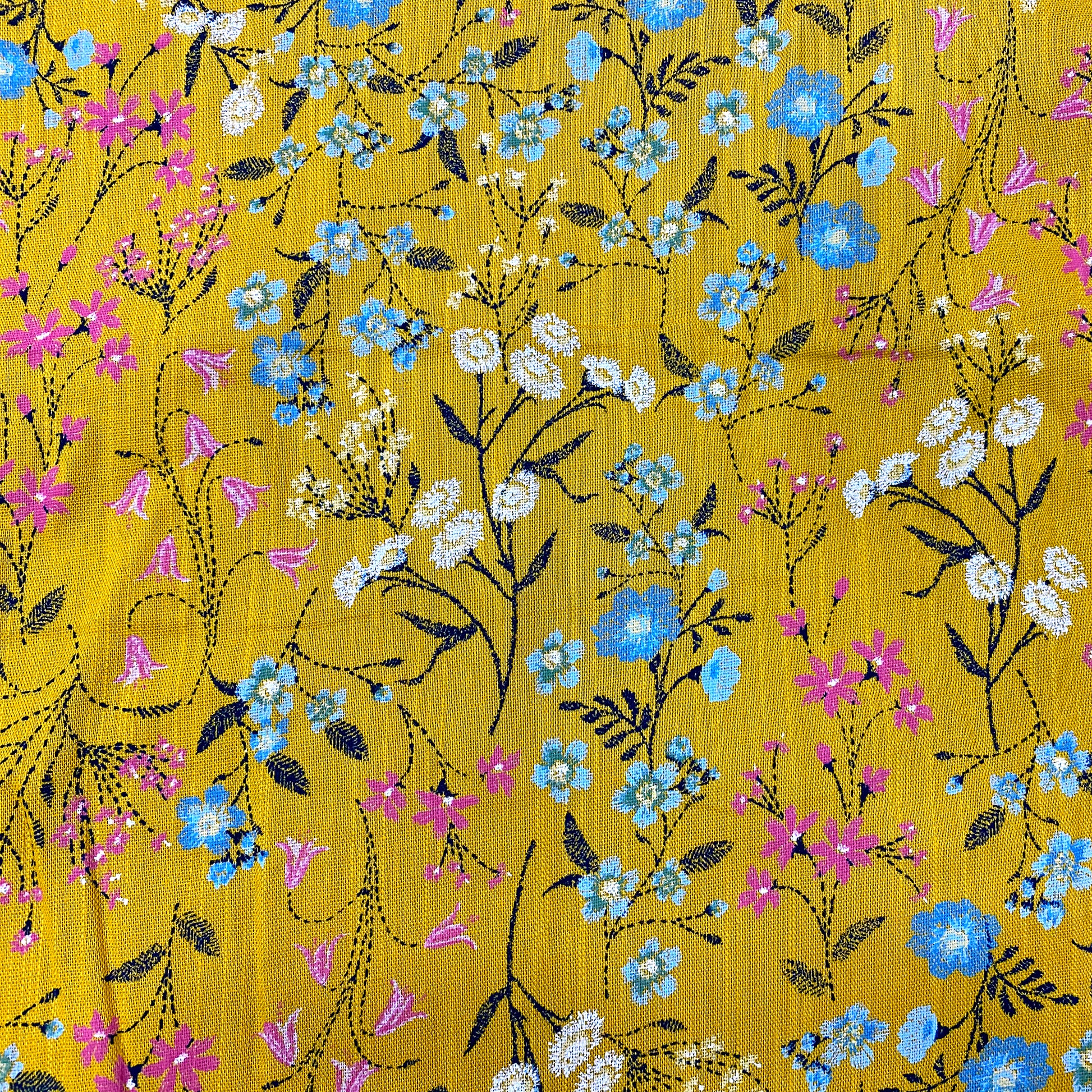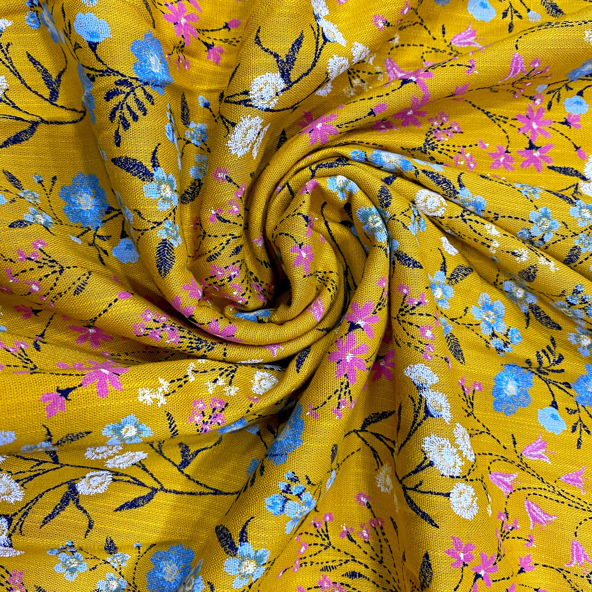Pretty summery beautiful mustard floral print on soft rayon fabric for dresses, shirts, palazzos and kurtas.