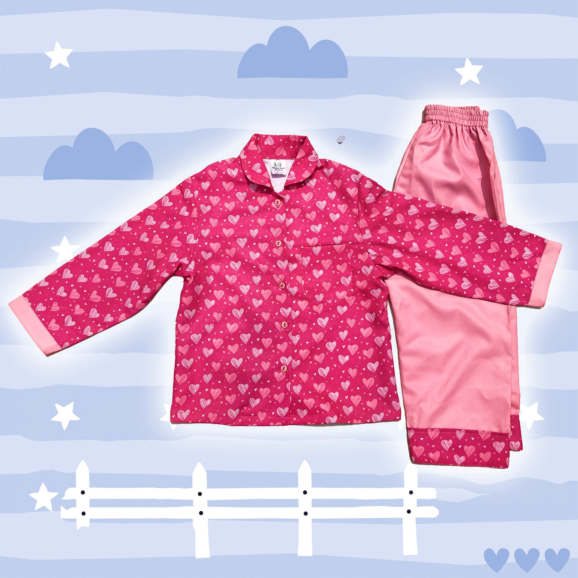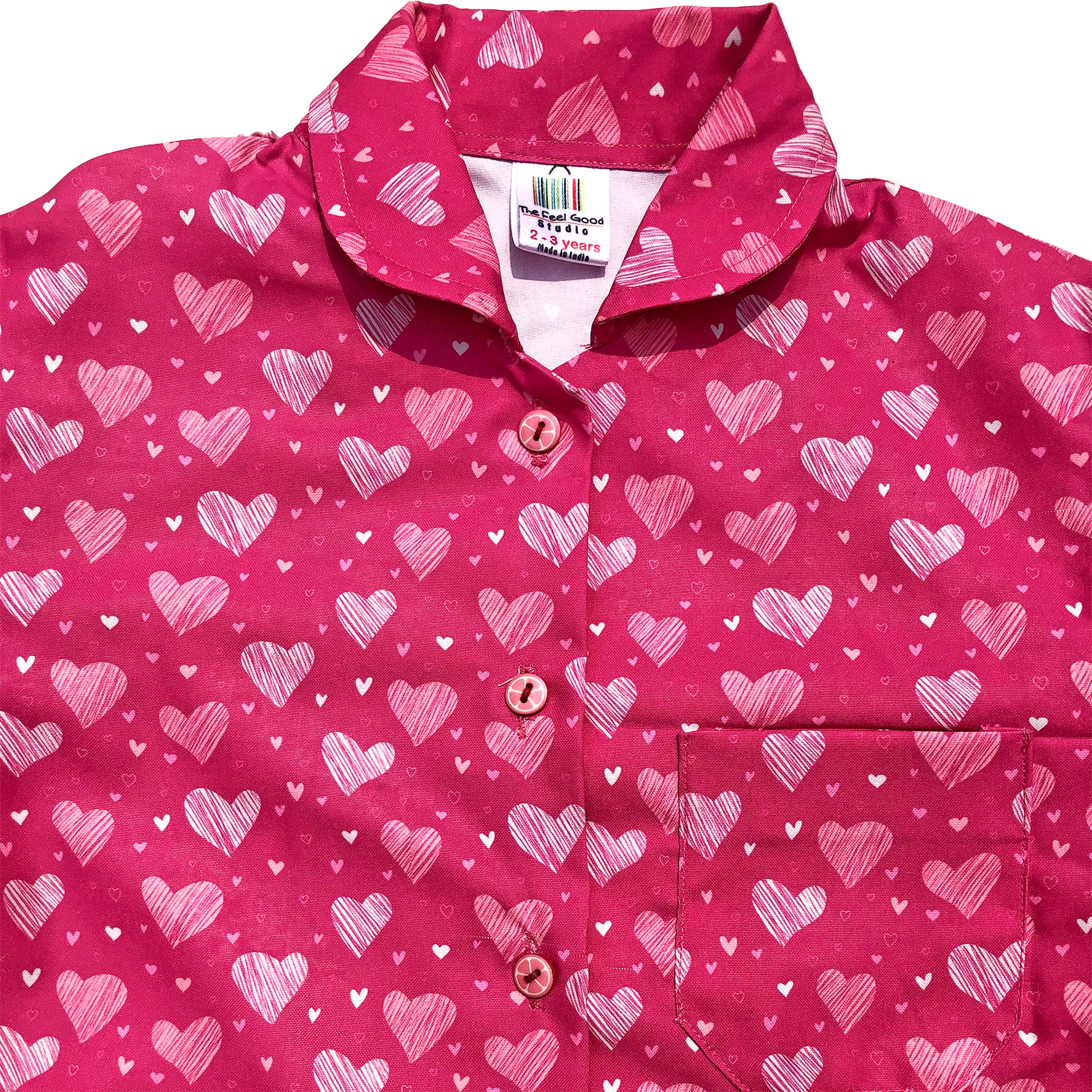 Heart print night suit on light cotton in soft and quick dry butter cotton fabric for your little heart. This is a quick dry fabric that does not stick to the skin and needs no ironing. The night suit comes with a practical button roll up feature in all pajamas till the age of 5 years.