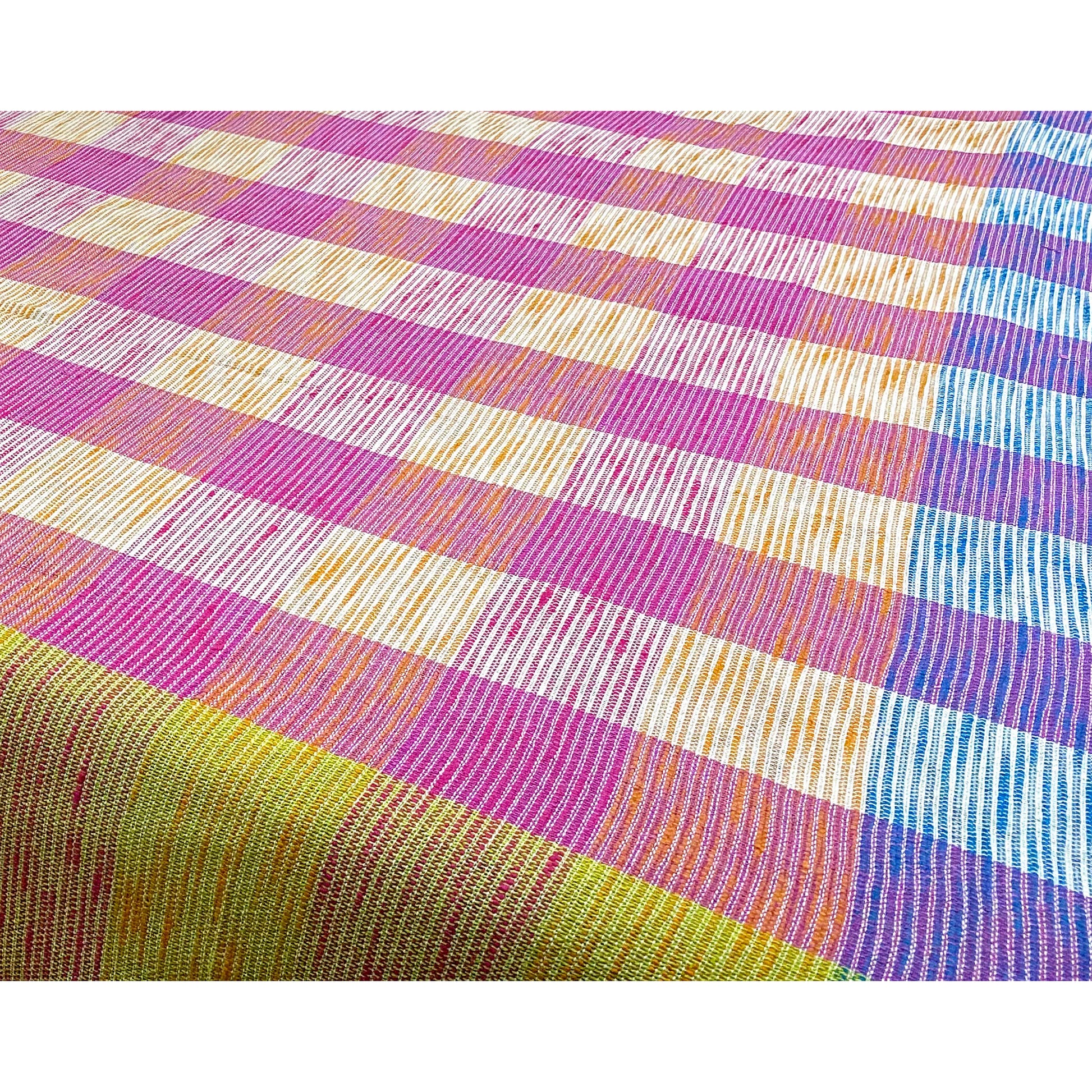 An elegant cotton bed cover in light pink, soothing yellow and light blue hues, woven by the skilled artisans of Uttar Pradesh .