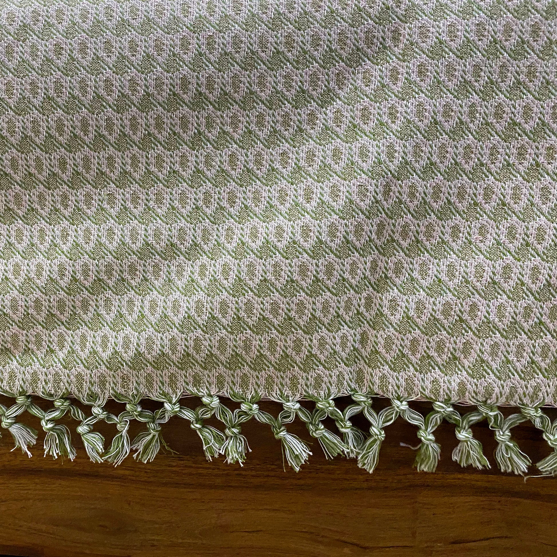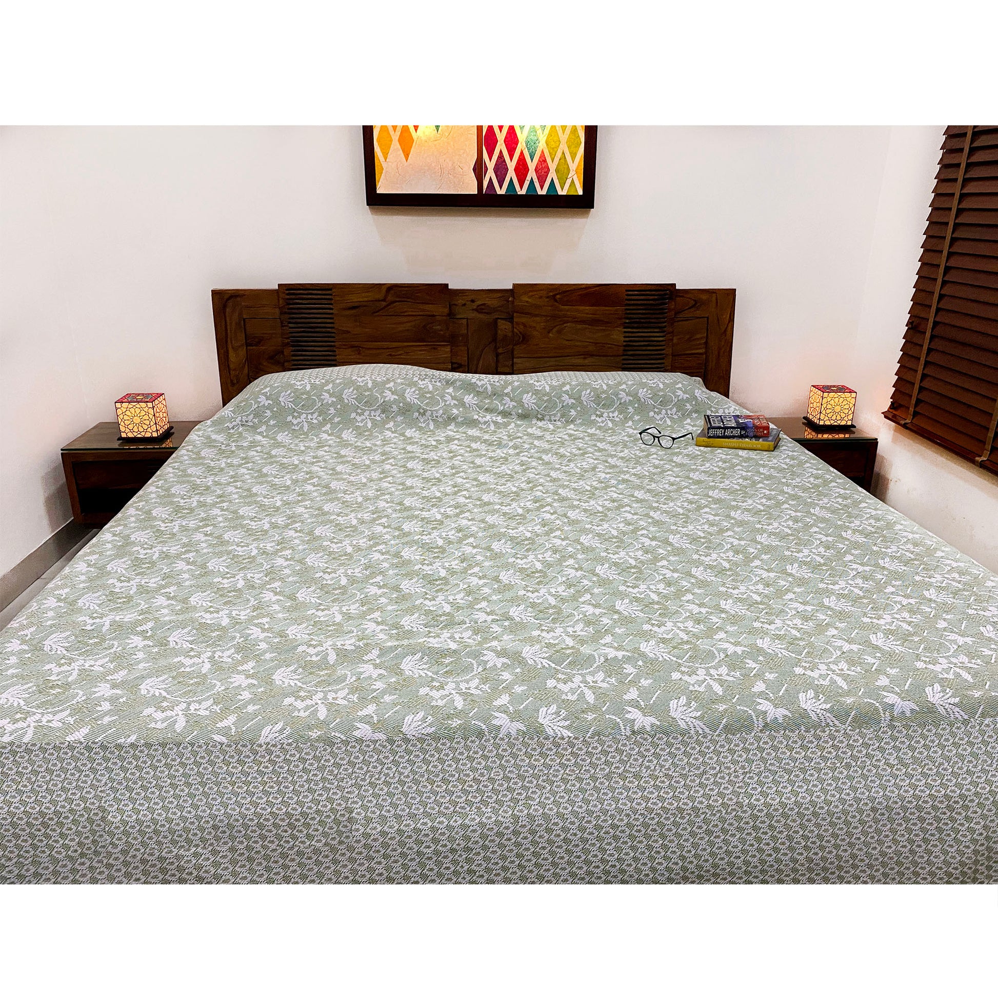 Elegant reversible bed cover in premium jacquard fabric; perfect to create an opulent Indie vibe in your bedroom or living room divan. This fine bedcover has shades of pastel green on one side and light peach on the reversible side. Buy it for yourself or give it as a great utility gift to a loved one. Get 15% OFF on First Purchase.