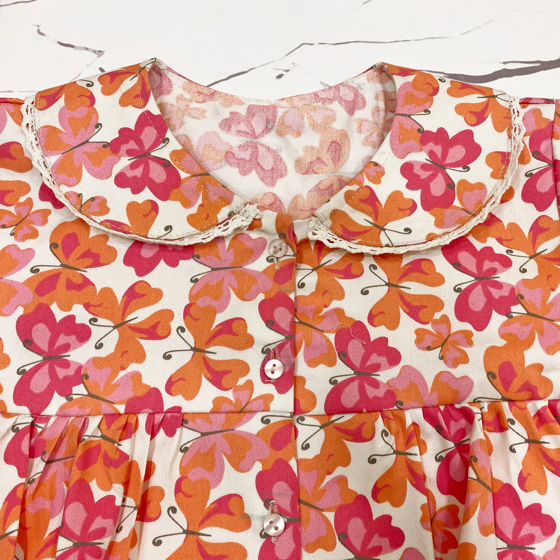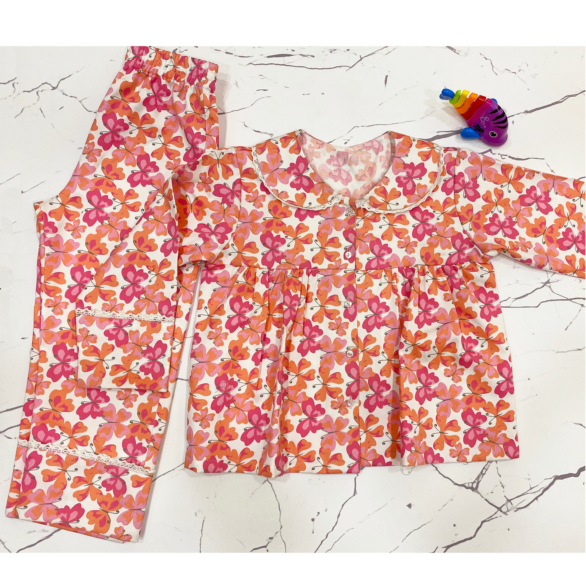 Soothing Butterfly Print Night Suit for girls with a cute peter pan collar in cotton fabric with delicate lace detailing.