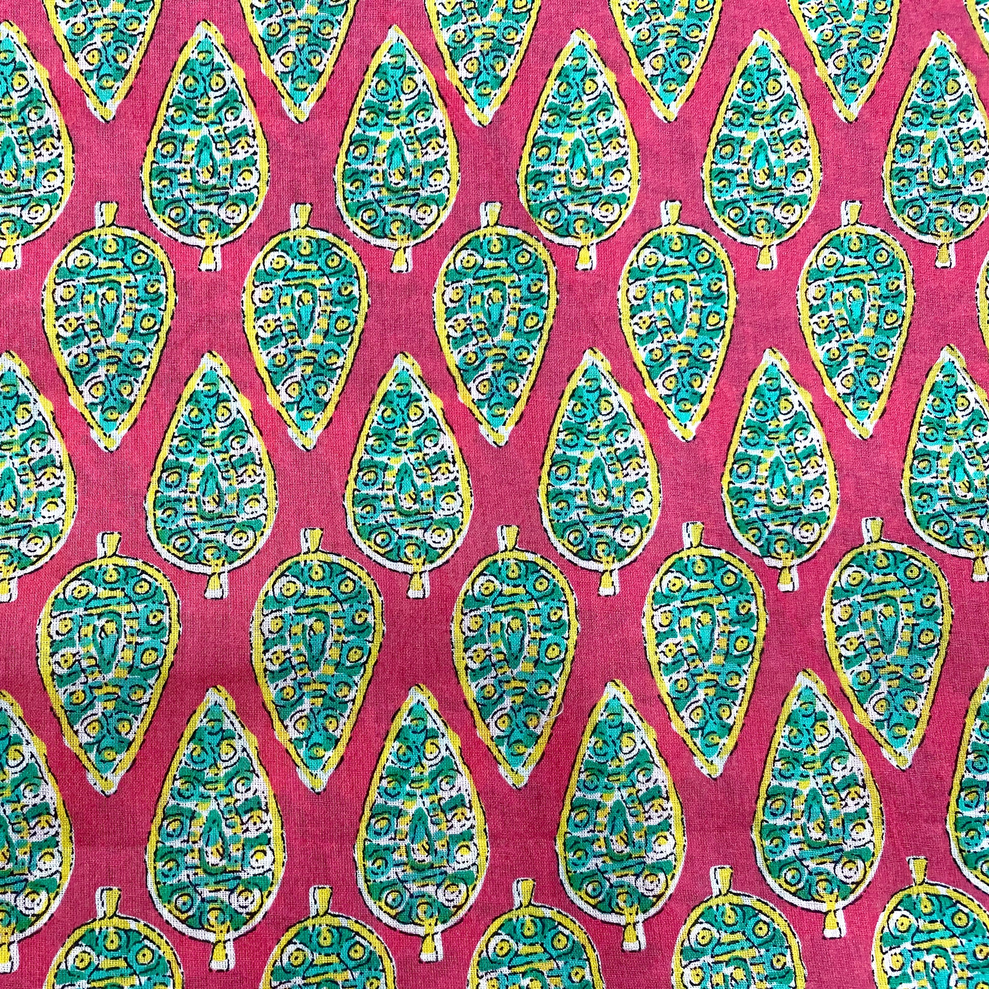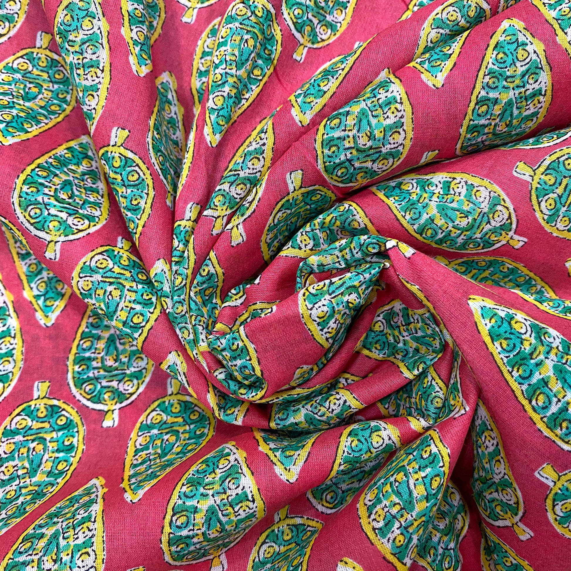 Beautiful peach and green printed light cotton super breathable fabric. This lightweight fabric is ideal for summery kurtas, sleeveless casual tops and indie shirts.