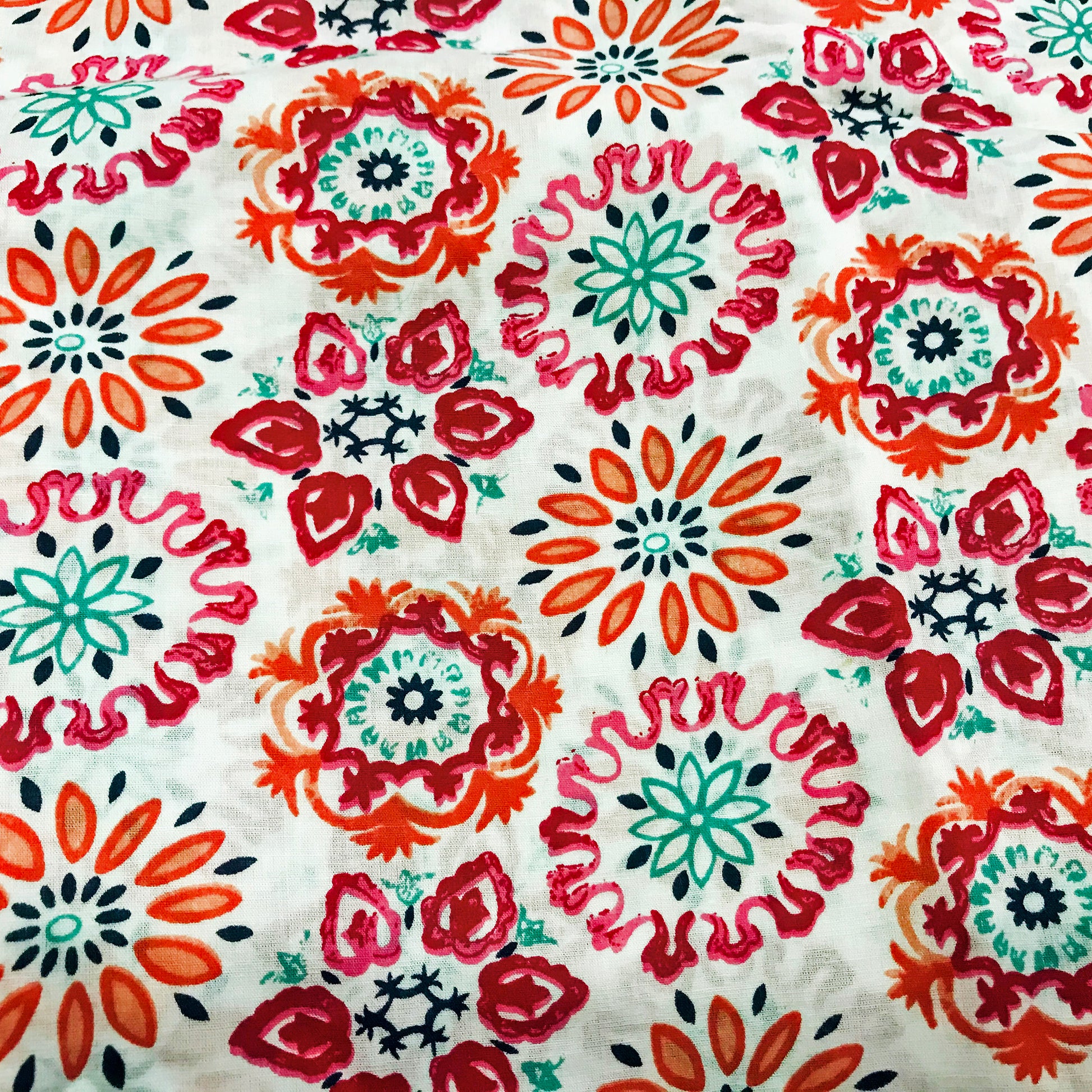 Floral patterned colourful Cotton Fabric. Make a nice summer dress or unusual palazzo pants for a chic look.