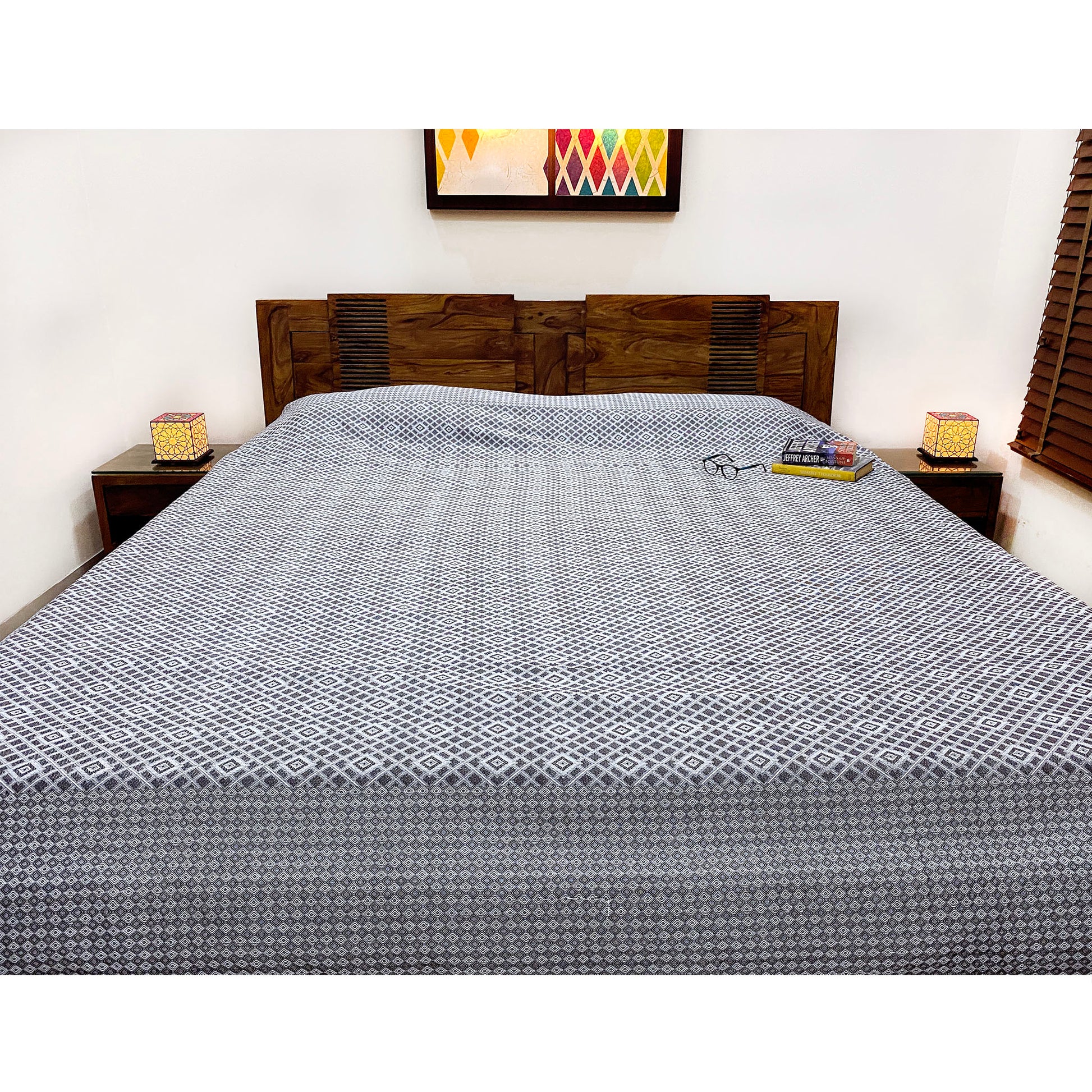 An elegant reversible handloom bedcover in grey and white intricate pattern. Buy it for yourself or give it as a great utility gift to a loved one. Get 15% OFF on First Purchase.