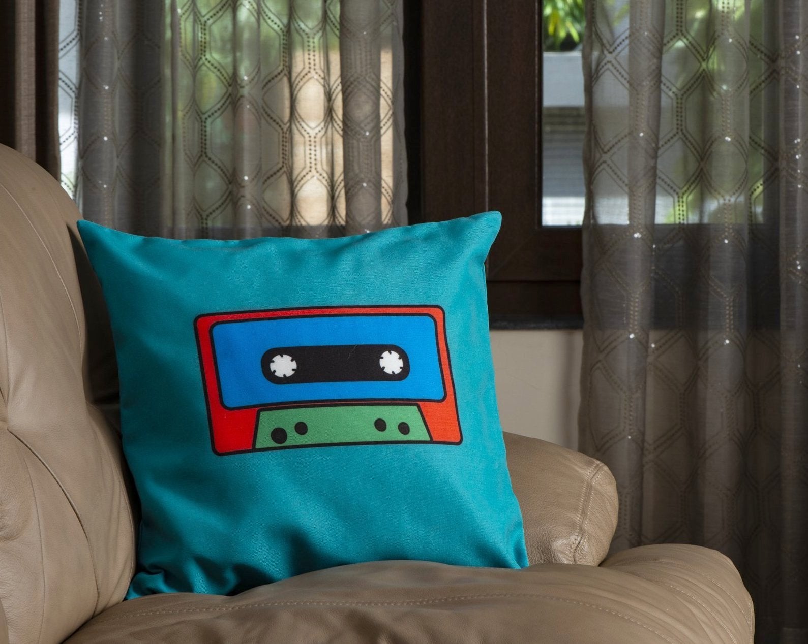 Add a stylish retro vibe to your sofa with this cassette-themed cushion cover. Offered in various sizes, it features a soft cotton-polyester blend that enhances comfort while elevating your living space’s aesthetic. Transform your home into a welcoming and trendy retreat with this expertly crafted cushion cover.