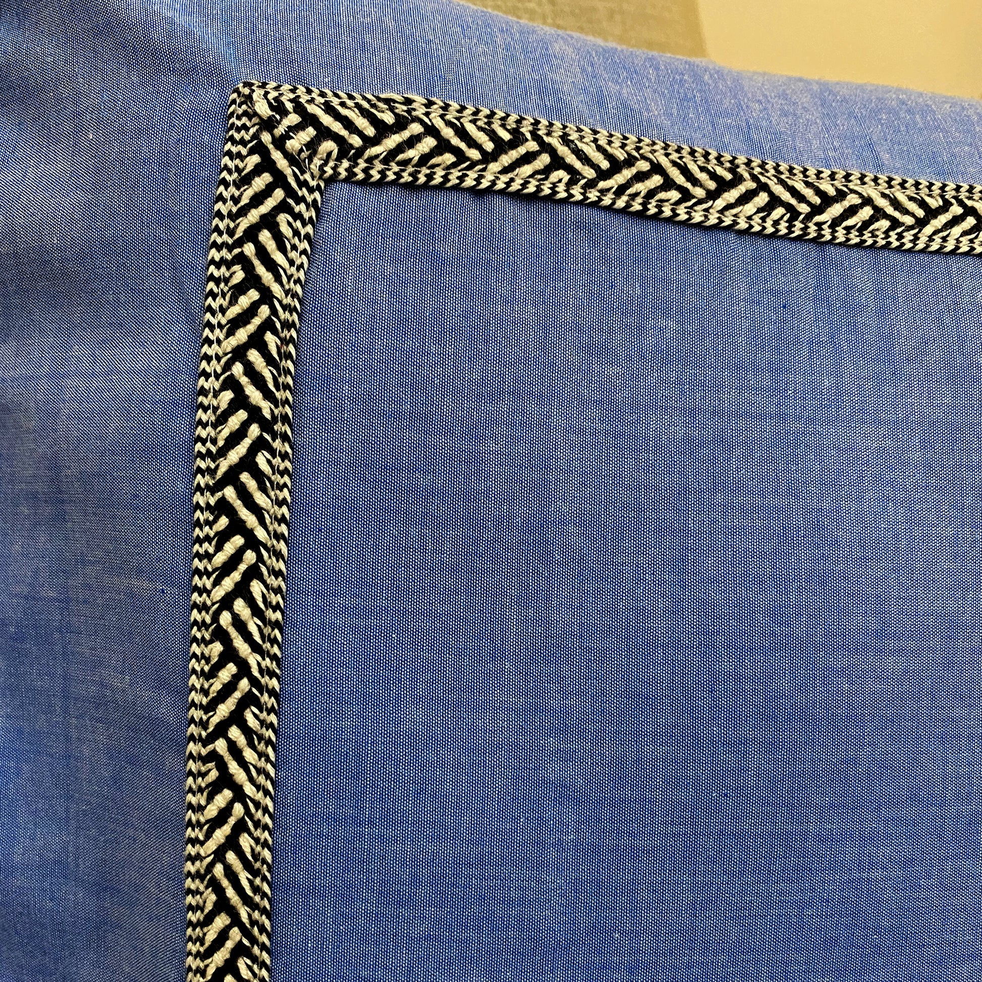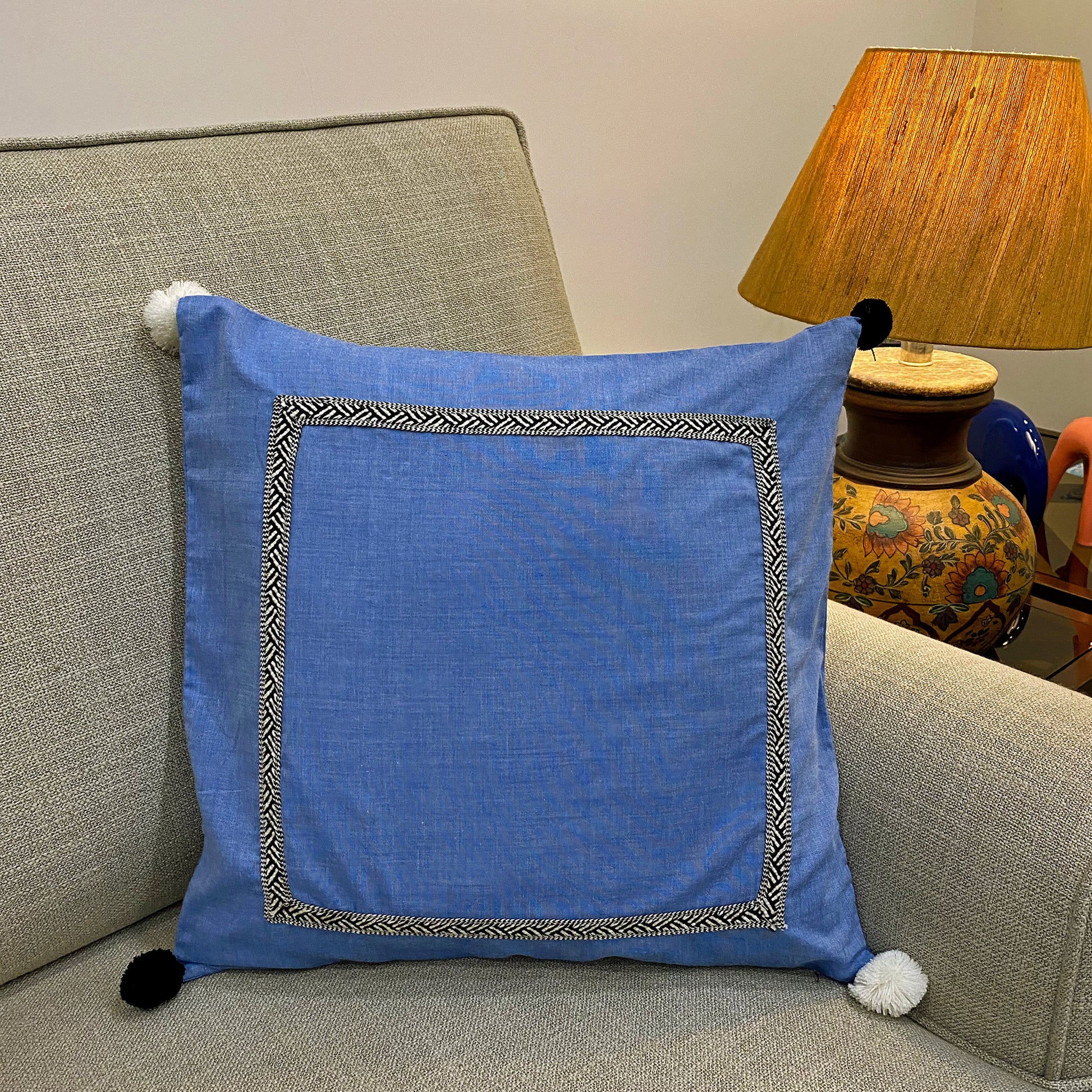 Simple and elegant blue cushion cover with delicate lacework and pretty pompoms, available in four different sizes. Perfect for chairs, or love seats, this cool cushion cover is a sure shot way to make any space look trendy and modern.