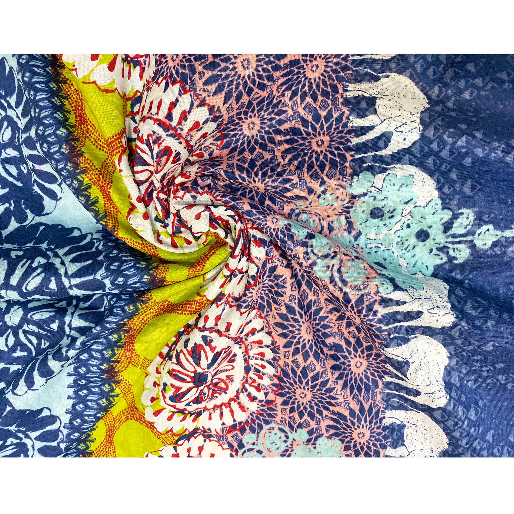 A vibrant and luxuriously soft cotton fabric with a unique elephant border. Make a chic summer dress or a beautiful kurta in this feather light printed cotton fabric online.