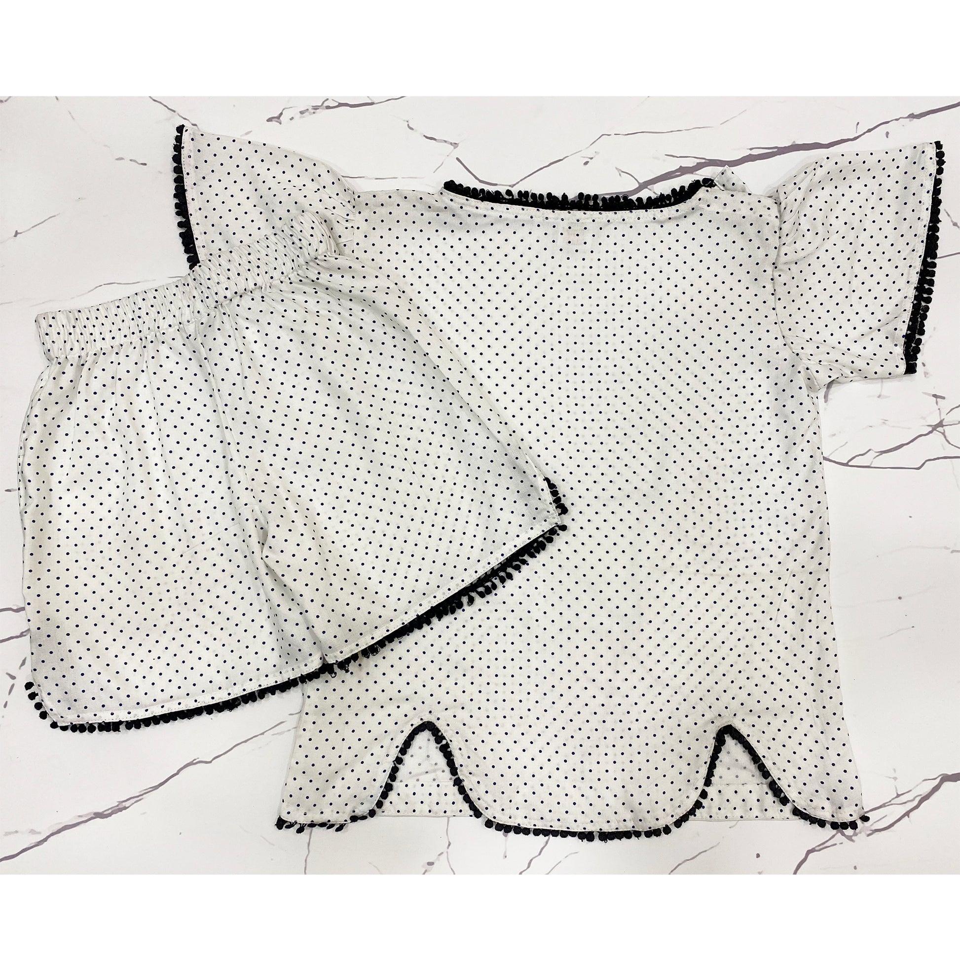 Polka Dot Black & White Night Suit for girls with comfy boat neck in softest rayon fabric with delicate lace detailing. All our pajamas come with a unique button roll-up feature till the age of 5. Simply unfold the fabric and adjust to the new length with the help of a button without worrying about sewing.