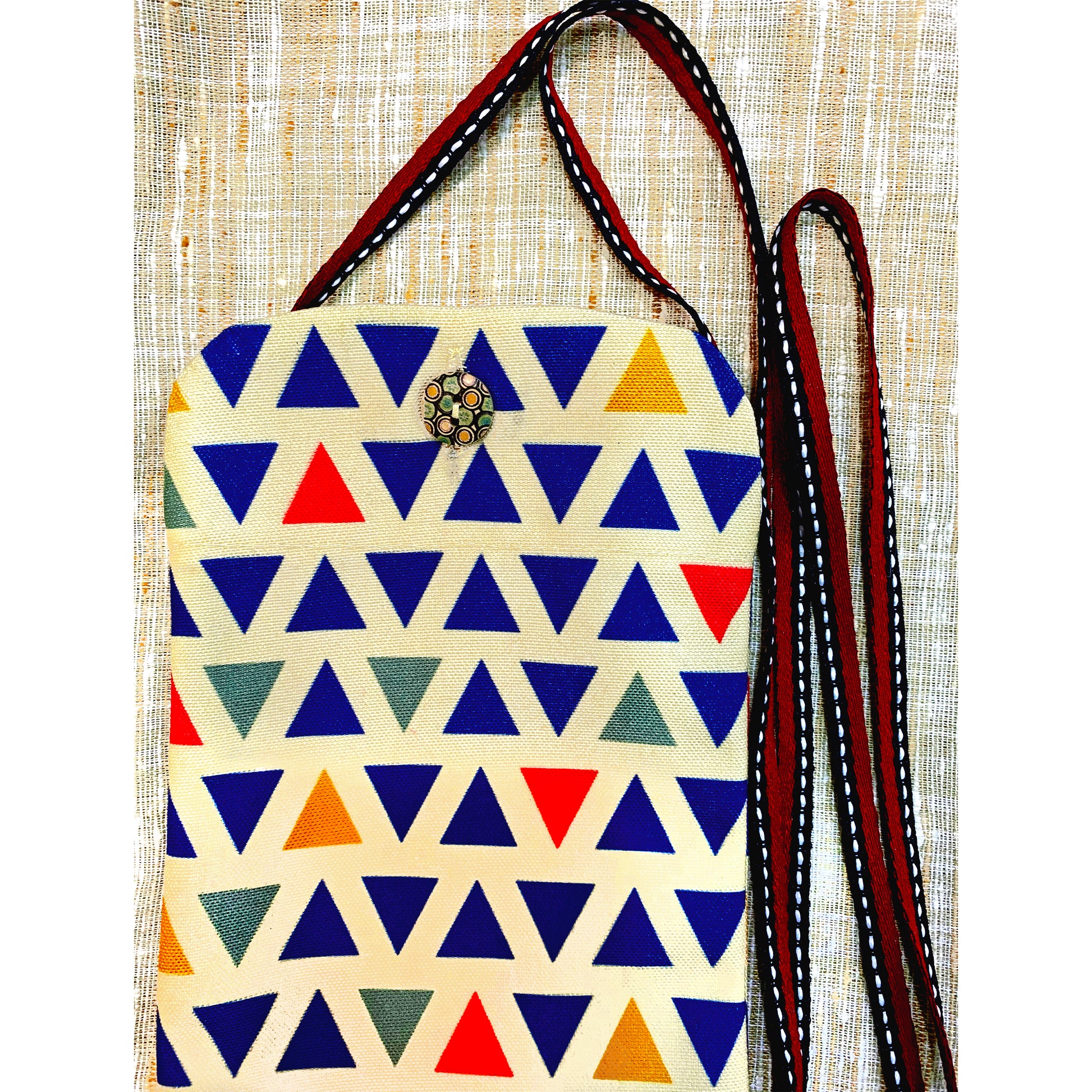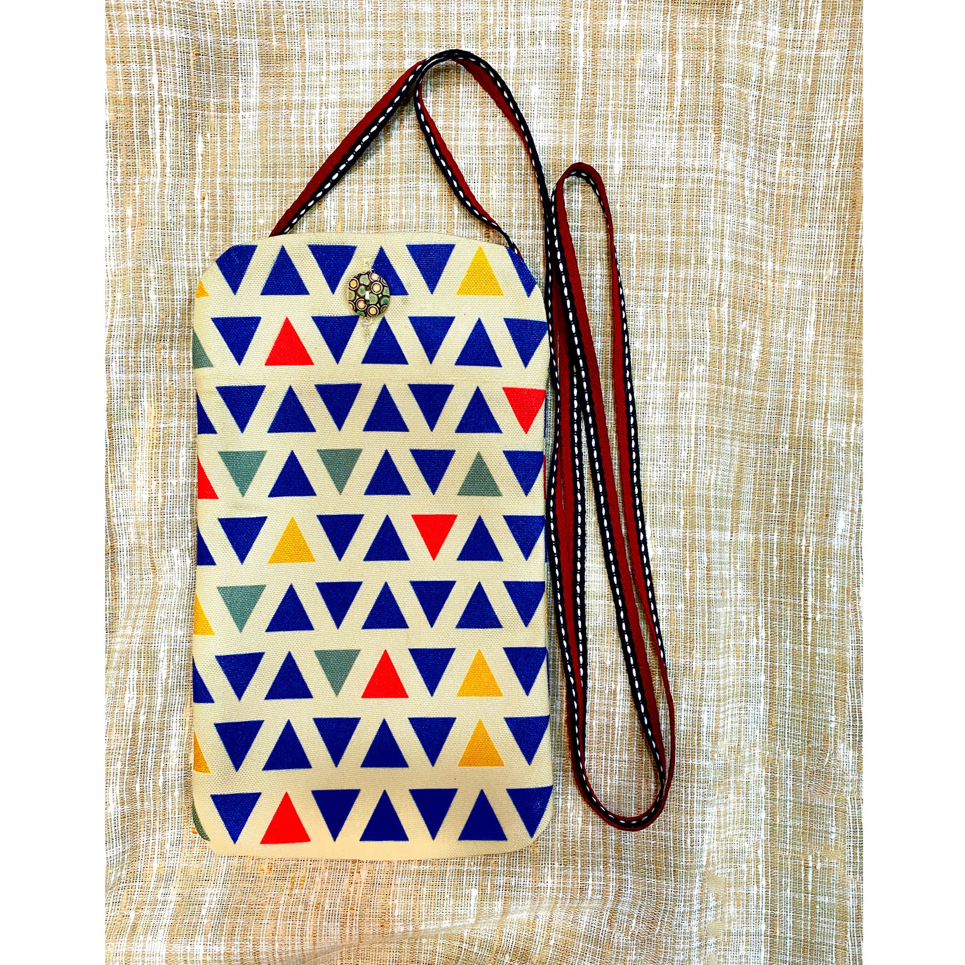 Tryst mini triangles utility pouch with beautiful button closure for festivals, short meetings, evening walks or quick trips to the convenience store. This practical to-go-bag comes with long strap and easily accommodates your cell-phone, cards, i-pod, cash , some tissues and earphones. Now walk hands-free with this light-weight fabric pouch made in India.
