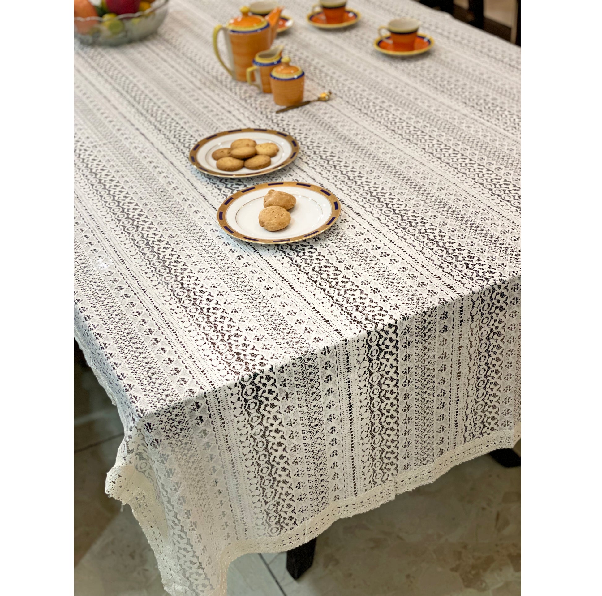 DESCRIPTION : Elevate your table decor this season with this beautiful victorian style table linen in dainty ivory white. Perfect for festive gatherings , this farm house style table cloth will take your table setting effortlessly to another level.
