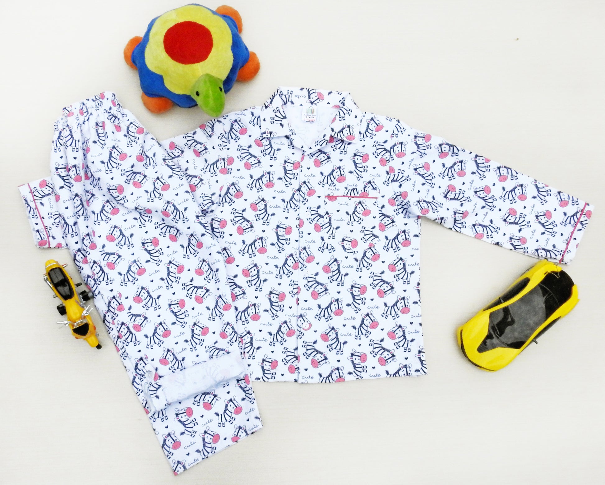 A super cute zebra printed nightsuit for your little one in soft butter cotton fabric.This fabric is quick to dry that does not stick to the skin and needs no ironing. The night suit comes with a practical button roll up feature in all pajamas.
